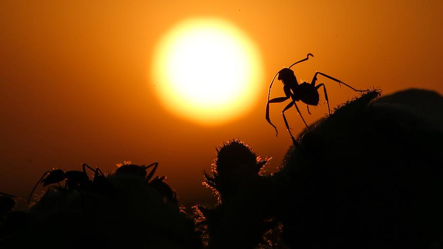 Dünya üzerinde yaşayan en kalabalık nüfusa sahip ve en çalışkan böceklerden karıncalar, Van'da gün batımı saatlerinde oluşan kızıllıkla çiçekli bitkilerin üzerinde güzel görüntüler oluşturdu. ( Özkan Bilgin - Anadolu Ajansı )