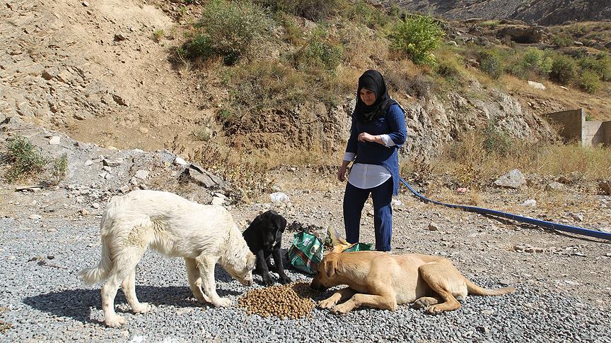 Hakkari'de yaşayan Rabia Aslan, soğuk havaların başlamasıyla sokak hayvanlarını, temin ettiği mamalarla besliyor.