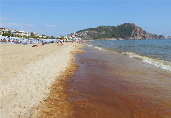 Alanya'nın dünyaca ünlü plajlarından Kleopatra Plajı, yağmur suyu dranaj hattından akan çamurlu su nedeniyle kızıla büründü.
