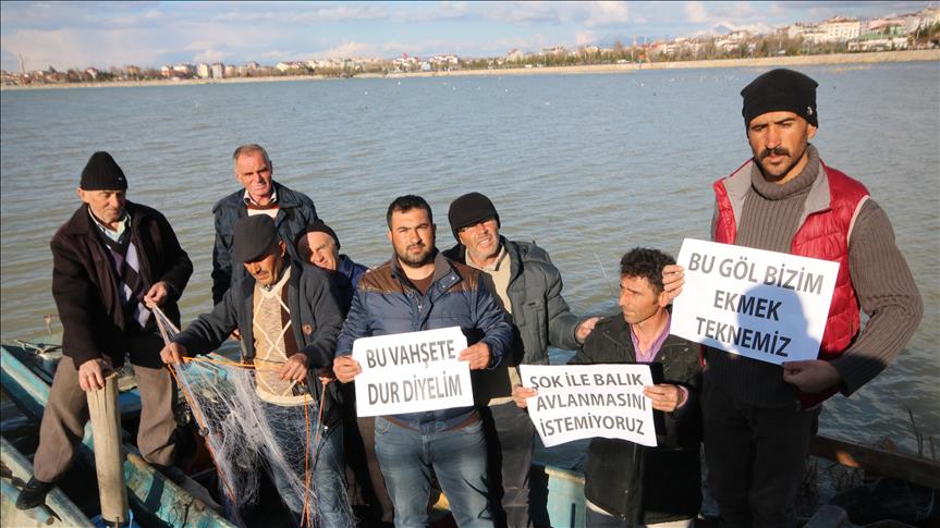 Balıkçılar, ellerindeki "Şok ile balık avlanmasını istemiyoruz", "Bu vahşete dur diyelim" ve "Bu göl bizim ekmek teknemiz" yazılı dövizlerle tepkilerini dile getirdi.