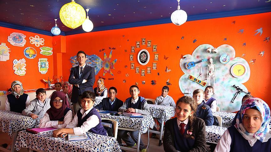 Bayburt'un Demirözü ilçesi Beşpınar köyündeki Şehit Gürcan Yavuz İmam Hatip Ortaokulu öğretmeni Emre Özel, öğrencilerine, tasarımını ve düzenlemesini kendisinin yaptığı, "galaksi tavan" sisteminin de yer aldığı sıra dışı sınıfta eğitim veriyor.