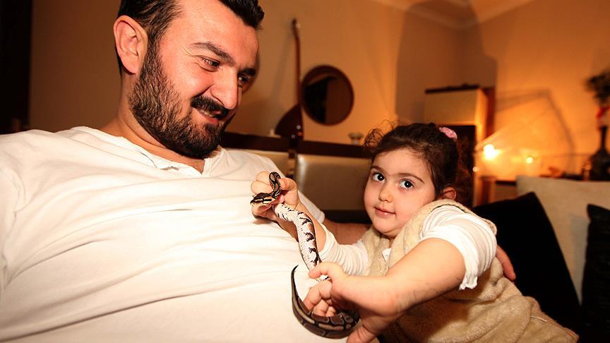 Samsun'da yaşayan Ferdi Demir, 3 yaşındaki kızı İclal'in isteği üzerine aldıkları pitonu evcil hayvan olarak evde besliyor.