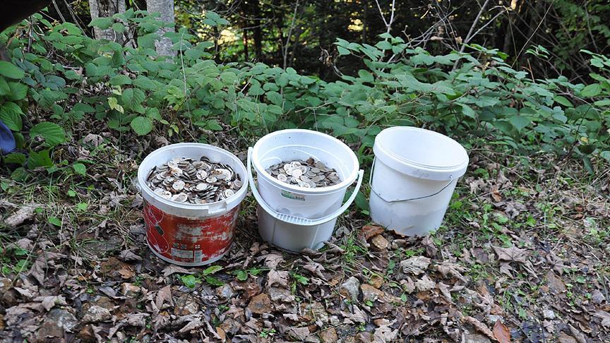 Sakarya'nın Hendek ilçesinde mantar toplamaya giden köylüler, 3 kova dolusu madeni para buldu.