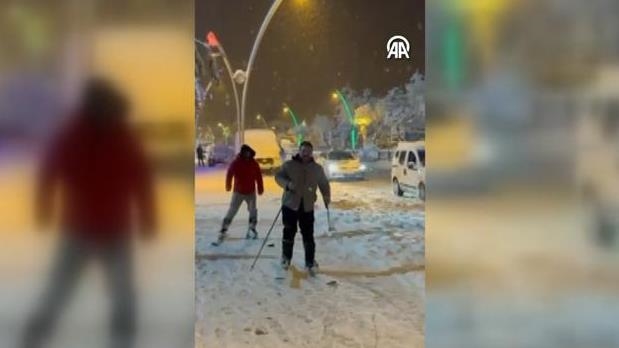 Dün akşam saatlerinde kayak takımlarıyla İstasyon Caddesi'ne giden esnaf Veysel Erten ile 2 arkadaşı, karla kaplı kaldırımda kayak yaparak eğlenceli anlar yaşadı.