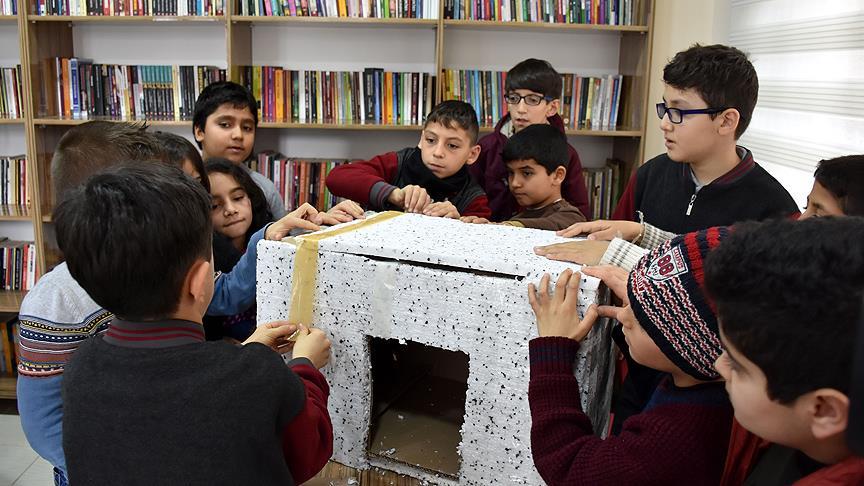 Bu kapsamda bilgievindeki kurslara katılan ilkokul öğrencileri, öğretmenlerinin de yardımıyla kutu ve strafor kullanarak sokak hayvanları için barınaklar yaptı.
