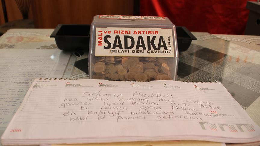 Sadaka kutusunun yanındaki takvimin üzerine, "Selamünaleyküm, ben sizin kapının açık olduğunu görünce içeri girdim. 35 lira aldım, bugün akşam bu parayı buraya bırakacağım. Hakkını helal et, paranı getireceğim." şeklinde not yazan şahıs, ardından kaçtı.