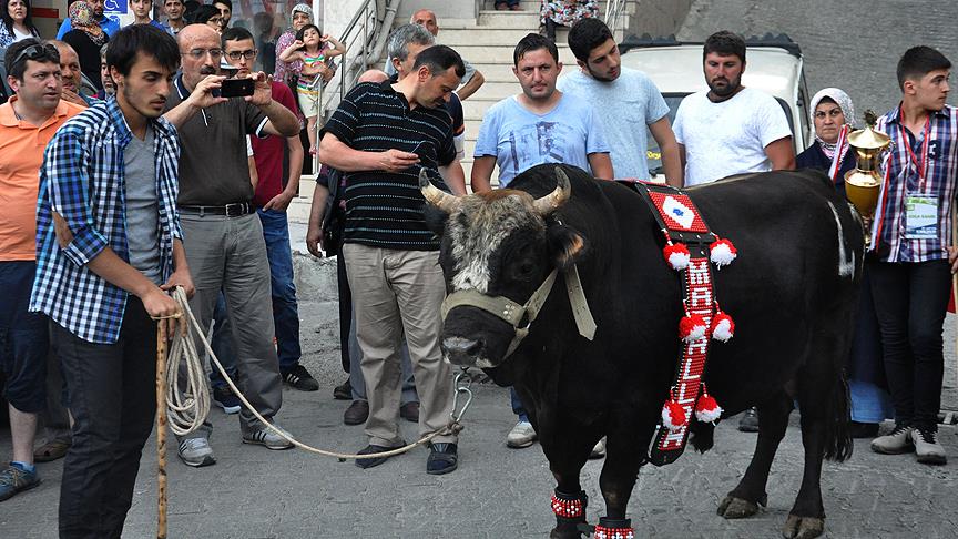 Artvin'de 37'nci Kafkasör Kültür Turizm ve Sanat Festivali kapsamında yapılan boğa güreşlerinde farklı kategorilerde şampiyon olan boğalar caddelerde dolaştırıldı.