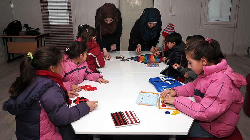 Konteyner kentteki zenginleştirilmiş sınıfta biri Türk, ikisi Suriyeli öğretmenden eğitim alan yaklaşık 200 çocuk, zeka ve hafıza geliştirici materyallerle desteklenerek geleceğe hazırlanıyor.
