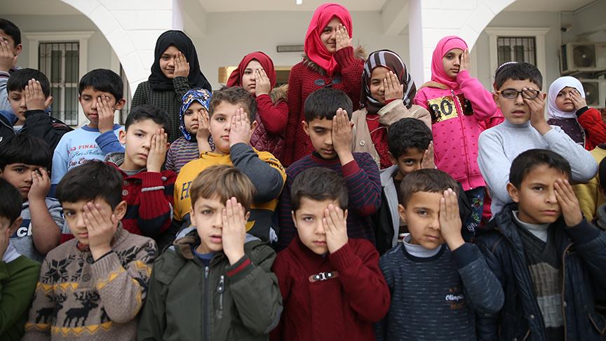 Ülkelerindeki iç savaştan kaçarak Türkiye'ye sığınan ve Şanlıurfa'da okula devam eden Suriyeli öğrenciler, Beşşar Esed rejiminin kuşatmasındaki Doğu Guta'da annesini ve tek gözünü kaybeden Kerim bebeğe tek gözlerini kapatarak destek verdi.
