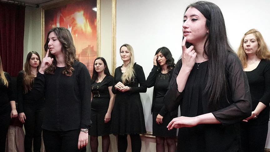 "İşaret dili öğreticiliği ve tercümanlığı" kursu öğrencileri, sertifika töreninde, İstiklal Marşı ile bazı şarkıları işaret diliyle söyledi.