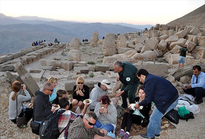 UNESCO Dünya Mirası Listesinde yer alan Nemrut Dağı'nı ziyaret eden turistler, ören yerindeki görevlilerin iftar sofrasına konuk oluyor.