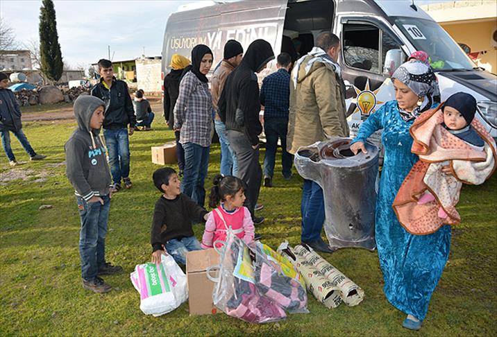 Battaniye, ısıtıcı, çocuk bezi, giysi ve gıda maddelerinin bulunduğu 8 minibüs ve tır dolusu yardım kolisi, Viranşehir ilçesine 30 kilometre uzaklıkta bulunan Eyyüp Nebi Mahallesi'ndeki sığınmacılara dağıtıldı.