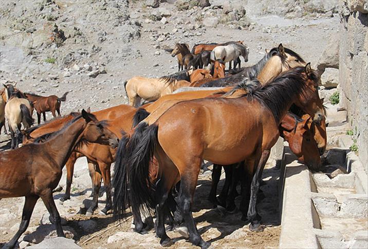 Mevsim normallerinin üzerinde seyreden hava sıcaklıkları, Karaman Karadağ'da doğal ortamda yaşayan yılkı atlarını da olumsuz etkiliyor. Su sıkıntısı çeken atlar, dağdaki tek su kaynağı olan çeşmenin başında su içebilmek için saatlerce bekliyor.