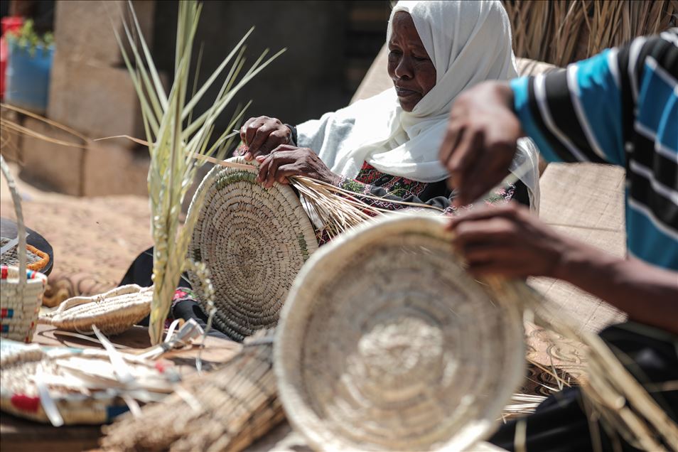 تحت ظلال أشجار النخيل، تجلس حميدة المنايعة (63 عامًا)، ومن حولها أبنائها، محمد (38 عامًا)، وسلمان (30 عاما)، منهمكون في تجهيز العديد من الأطباق والأواني المصنوعة من سعف النخيل، في مهنةٍ يُطلق عليها "الخوّاص".
