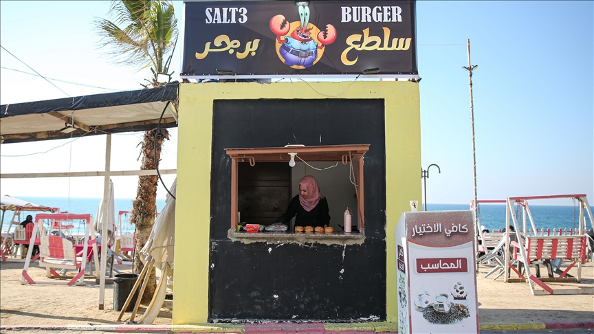 حمل هذا الكشك الصغير، الذي افتتحه الشابة (25 عاما) في مكان يطل على بحر مدينة غزة، اسم "سلطع برجر" وبجانب اسمه صورة لشخصية "مستر سلطع" الكرتونية.