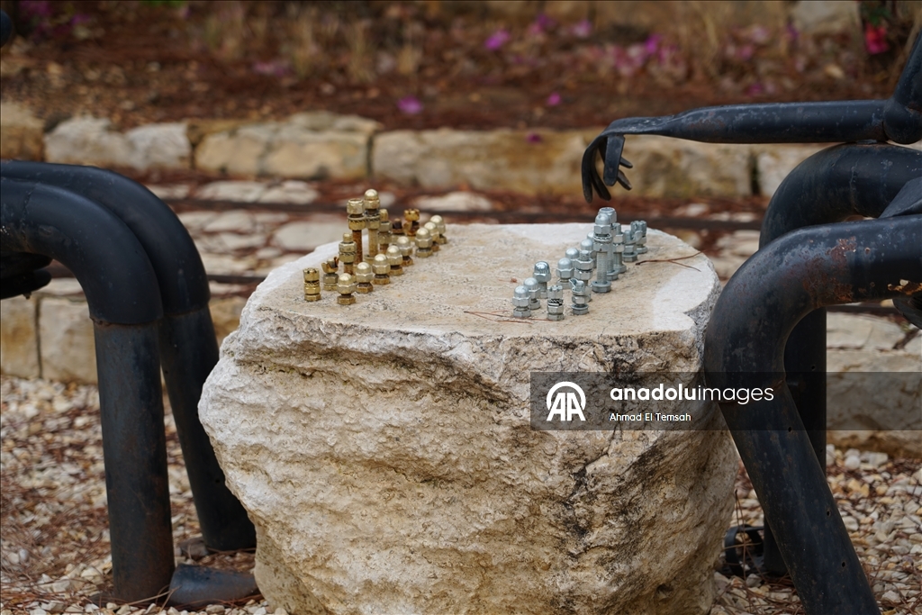 وفي لمسة مبتكرة، تجد مجسما لموسيقي يعزف على كمان مصنوع من قذيفة هاون، وآخر يضرب على طبلة مستوحاة من قذيفة "إينيرغا" وصبي عبارة عن قذيفة هاون يمشط شعره بفرشاة صنعت من مسامير القذيفة.