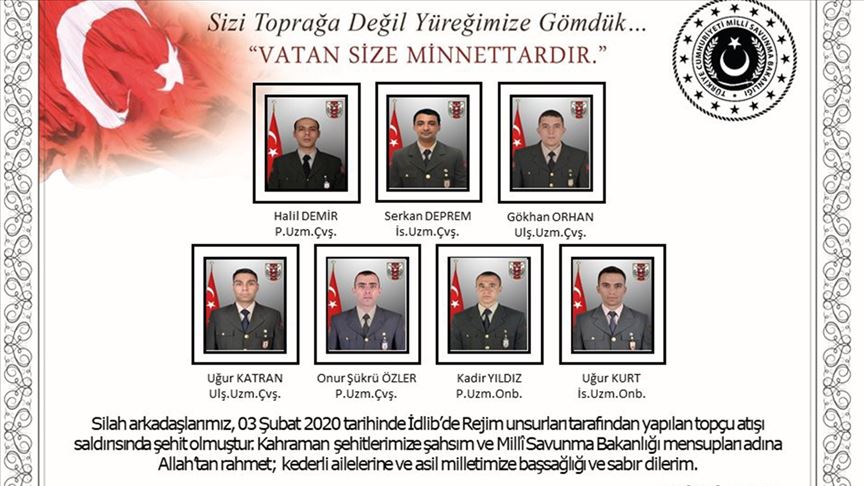 والإثنين، استشهد 7 جنود أتراك ومدني، جراء قصف مدفعي مكثف للنظام السوري في محافظة إدلب.