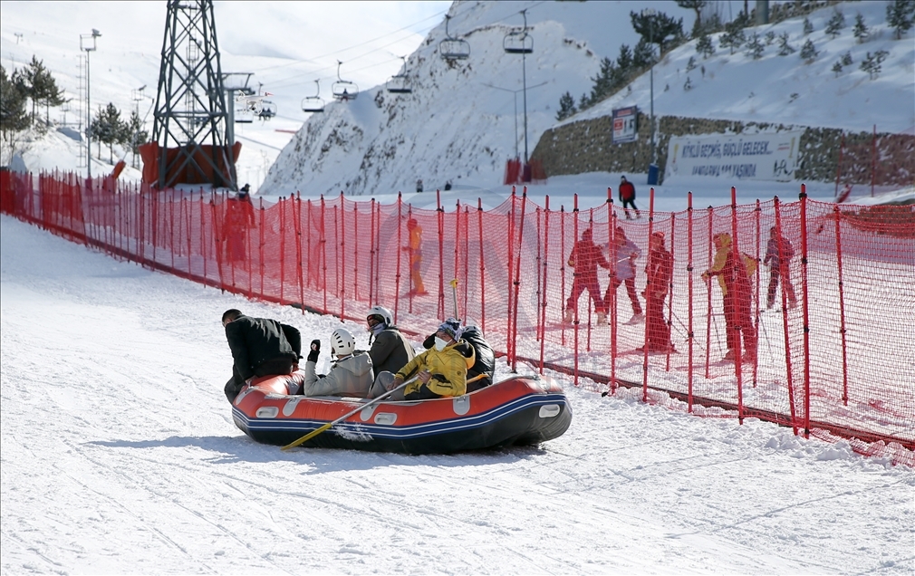 زار أعضاء نادي "Macera Off Road" للرياضات الطبيعية، الأحد، مركز "بالاندوكان" للتزلج بولاية أرضروم شرقي تركيا، وقدموا عرضا للتزلج على الثلج بقوارب التجديف.