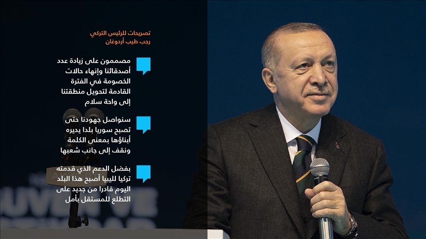 أردوغان، قال إن من بين انفتاحات تركيا في السياسة الخارجية أيضًا، الاتفاق الذي أبرمته مع الحكومة الليبية الشرعية بشأن مناطق الصلاحية البحرية في المتوسط، عام 2019.