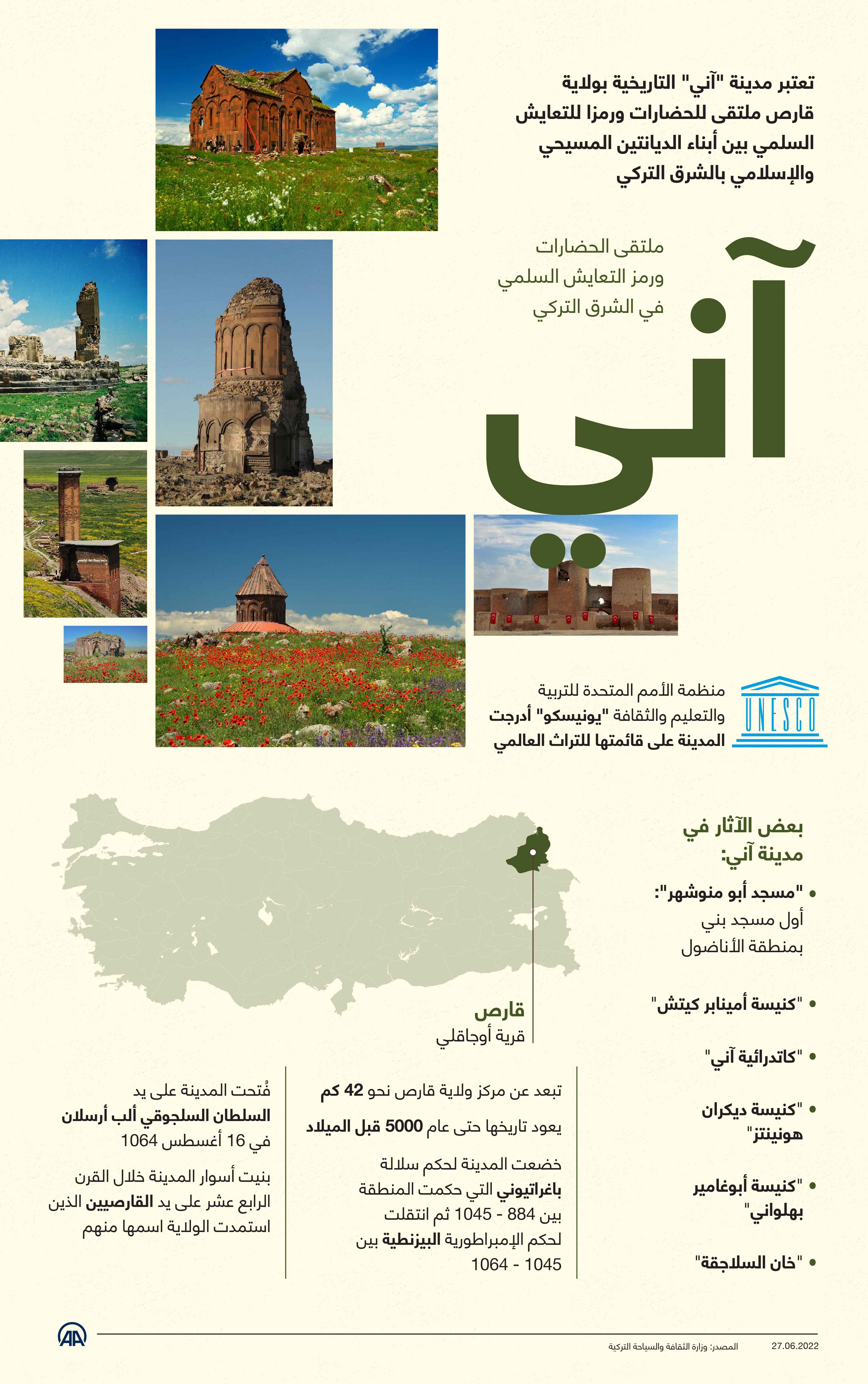 تعتبر مدينة "آني" التاريخية بولاية قارص ملتقى للحضارات ورمزا للتعايش السلمي بين أبناء الديانتين المسيحي والإسلامي بالشرق التركي.