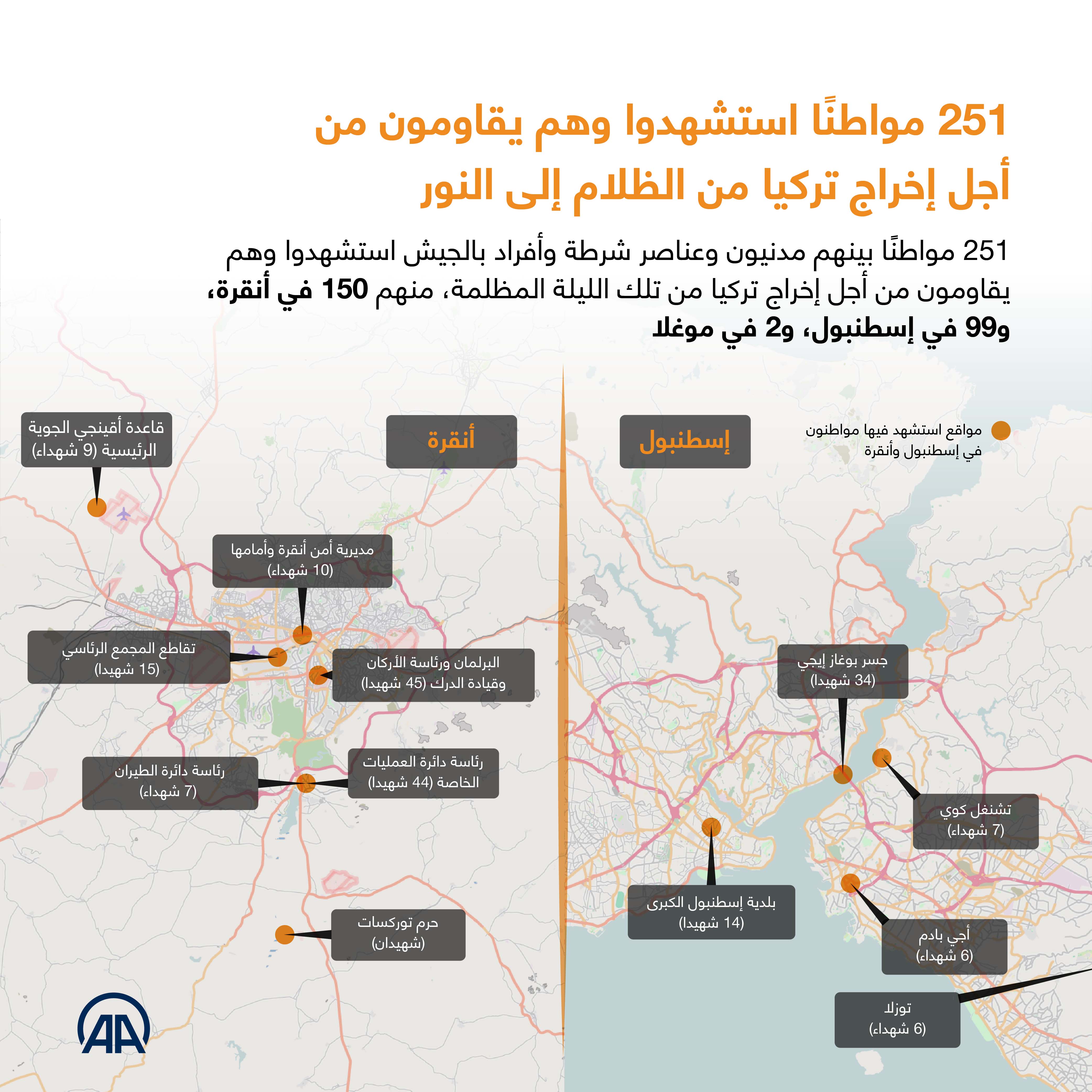 251 مواطنًا بينهم مدنيون وعناصر شرطة وأفراد بالجيش استشهدوا وهم يقاومون من أجل إخراج تركيا من تلك الليلة المظلمة، منهم 150 في أنقرة، و99 في إسطنبول، و2 في موغلا.