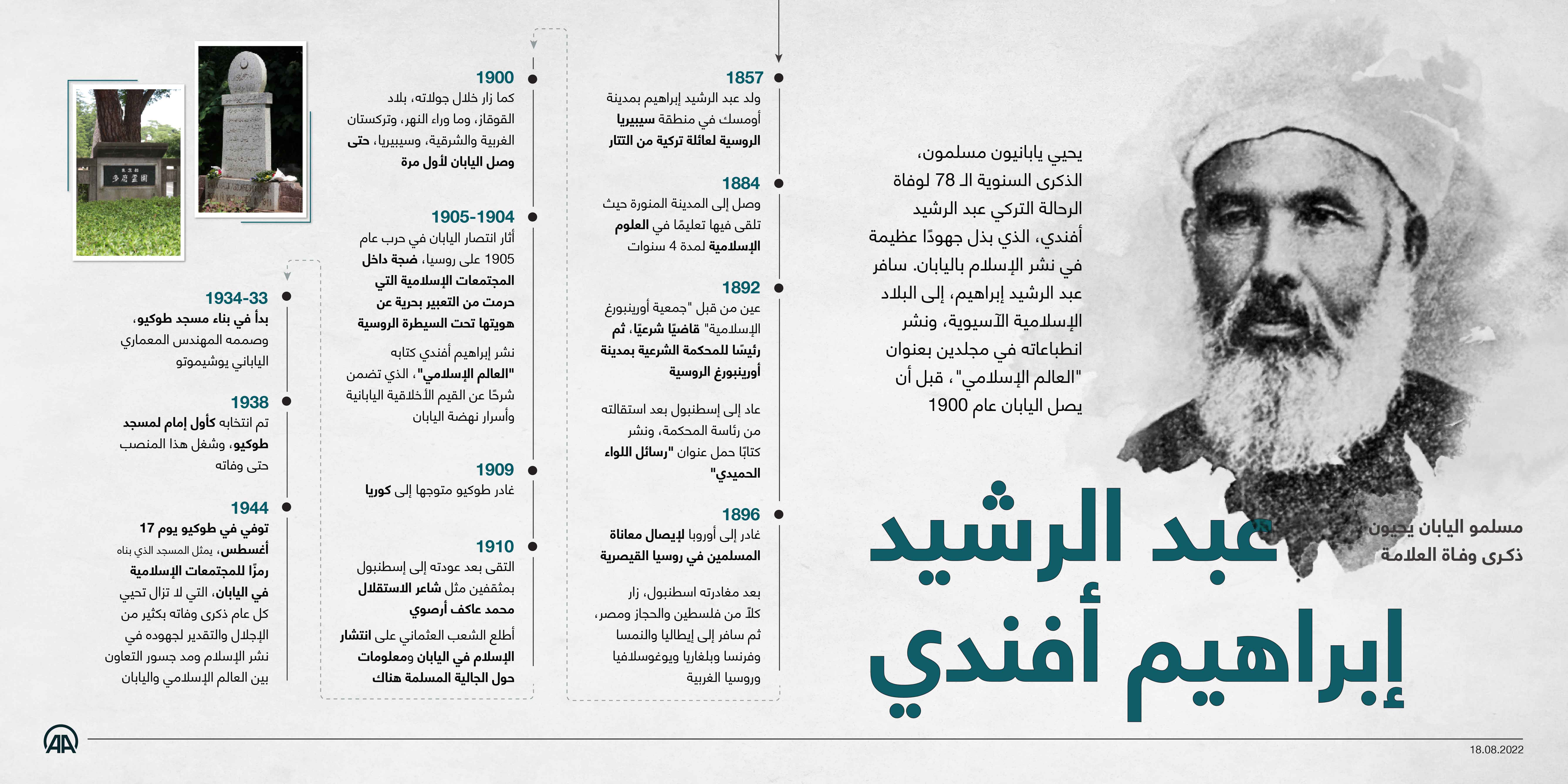 يحيي يابانيون مسلمون، الذكرى السنوية الـ 78 لوفاة الرحالة التركي عبد الرشيد أفندي، الذي بذل جهودًا عظيمة في نشر الإسلام باليابان. سافر عبد الرشيد إبراهيم، إلى البلاد الإسلامية الآسيوية، ونشر انطباعاته في مجلدين بعنوان "العالم الإسلامي"، قبل أن يصل اليابان عام 1900