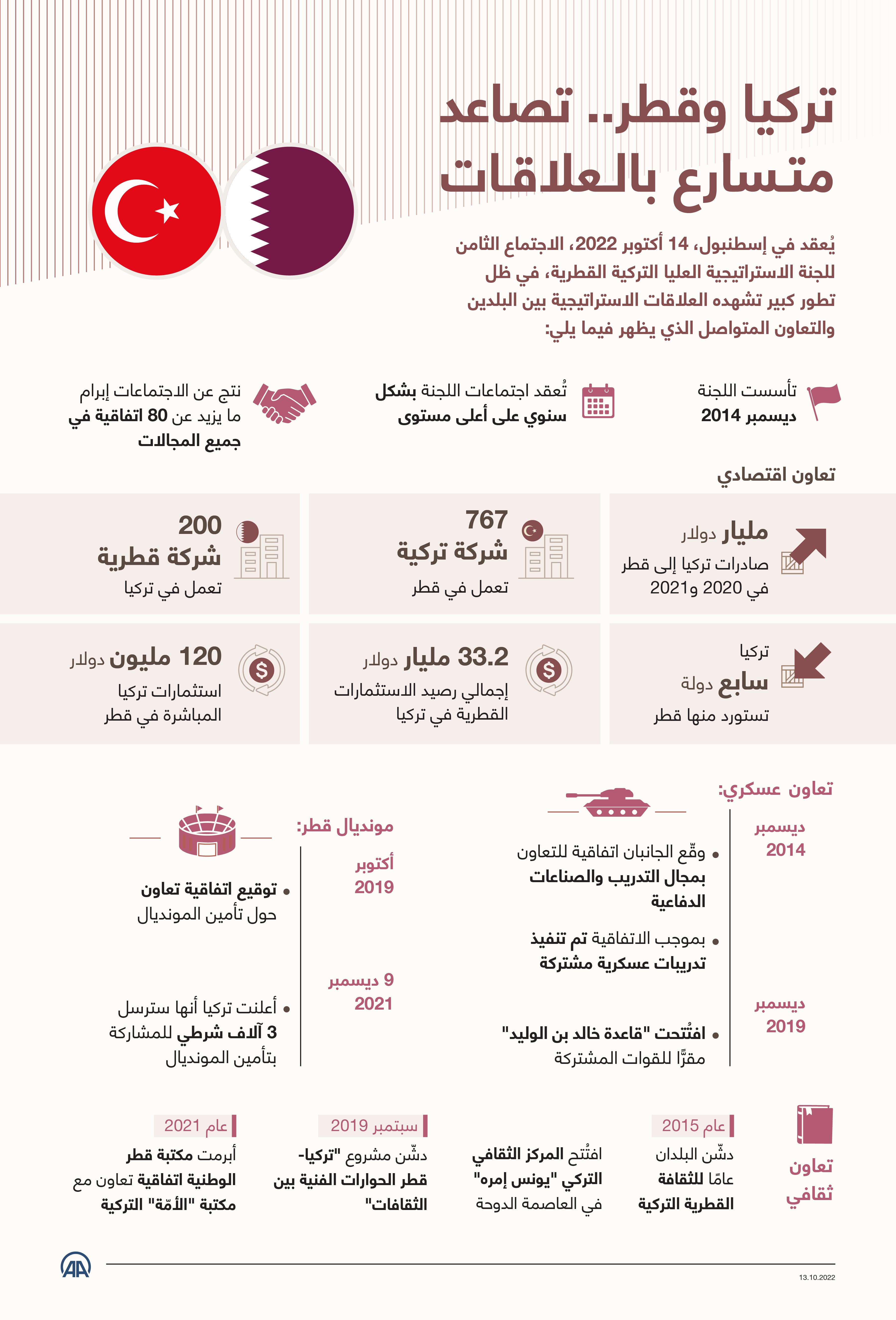 يُعقد في إسطنبول، 14 أكتوبر 2022، الاجتماع الثامن للجنة الاستراتيجية العليا التركية القطرية، في ظل تطور كبير تشهده العلاقات الاستراتيجية بين البلدين والتعاون المتواصل.