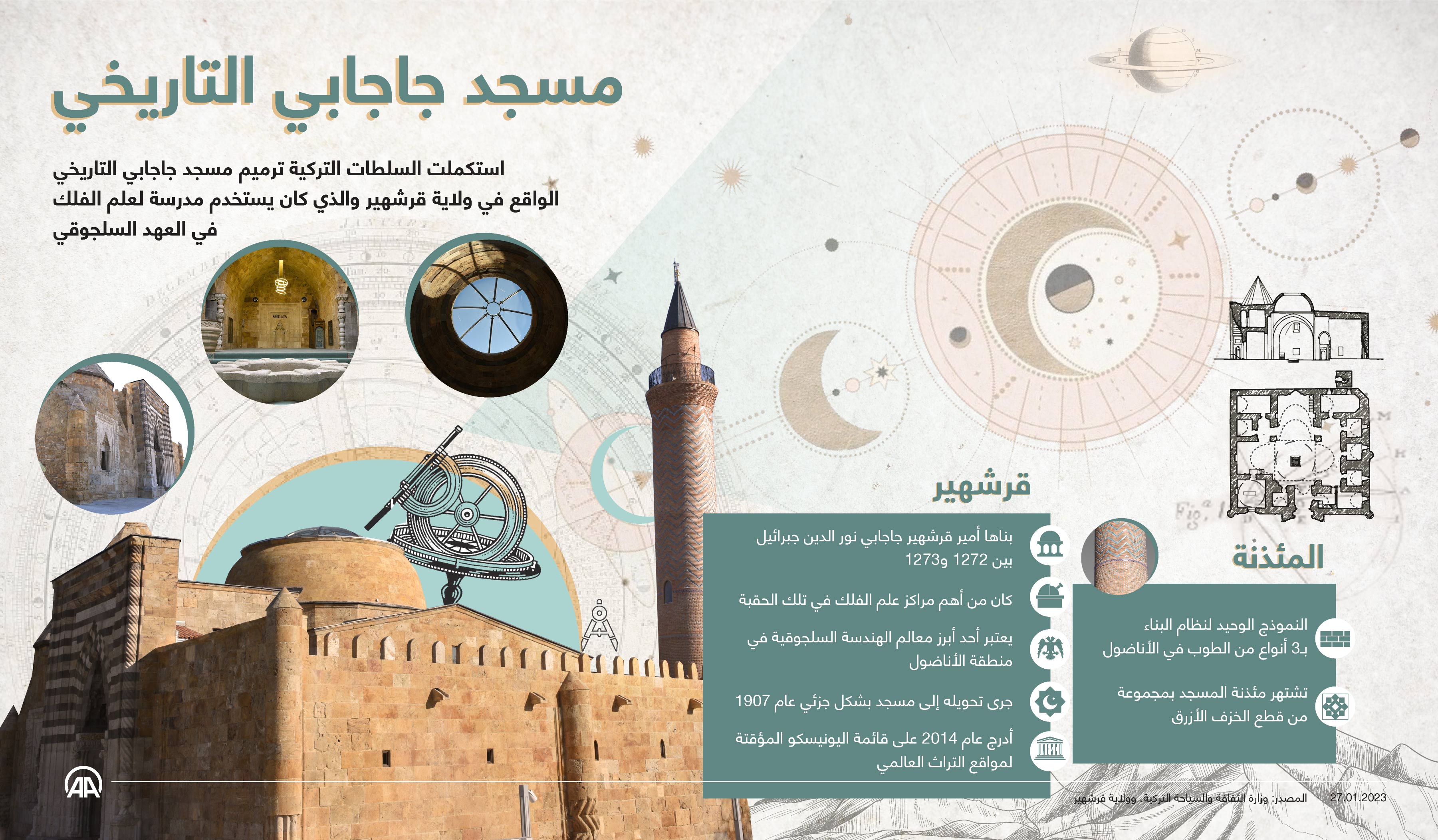 استكملت السلطات التركية ترميم مسجد جاجابي التاريخي الواقع في ولاية قرشهير والذي كان يستخدم مدرسة لعلم الفلك في العهد السلجوقي