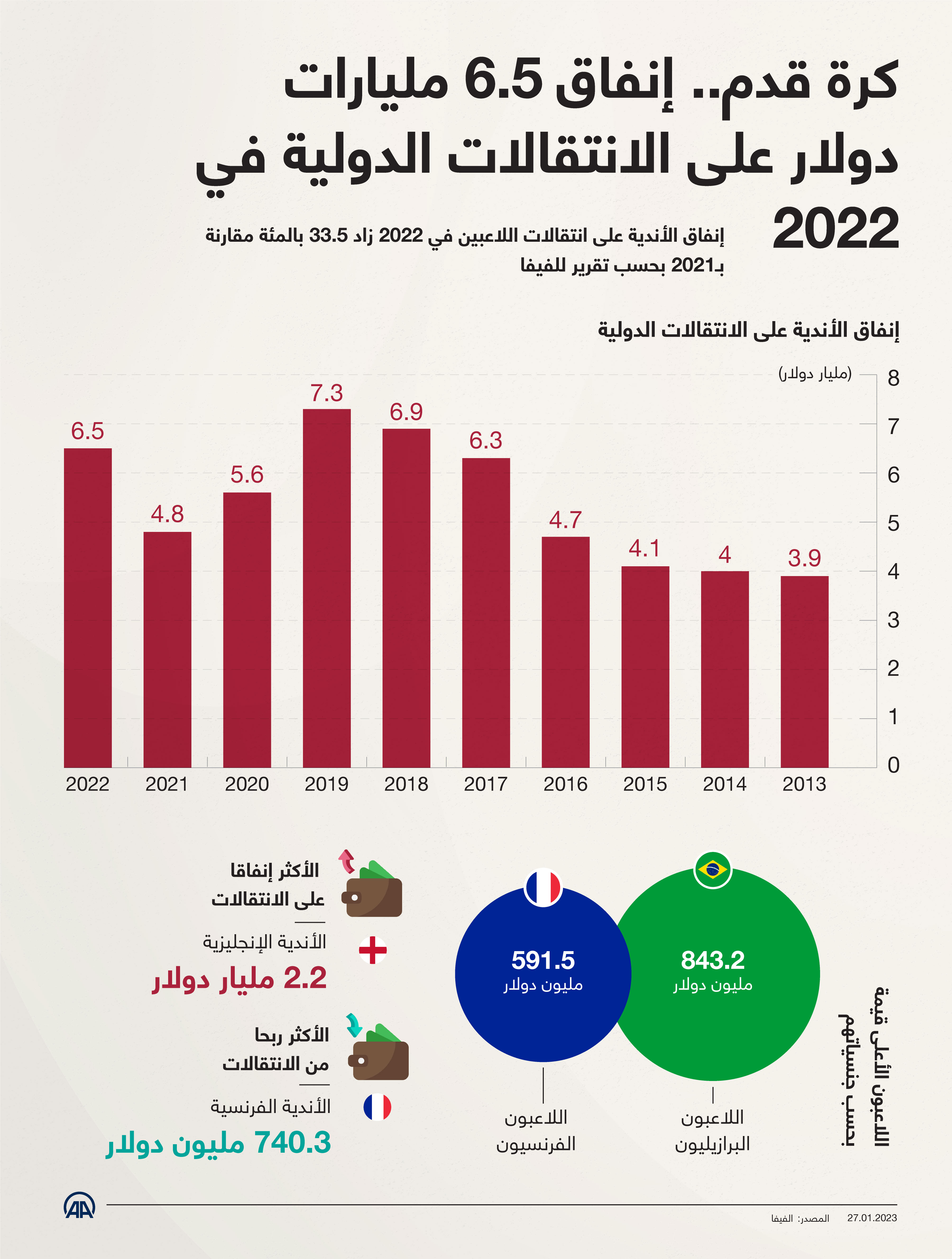 كرة قدم.. إنفاق 6.5 مليارات دولار على الانتقالات الدولية في 2022