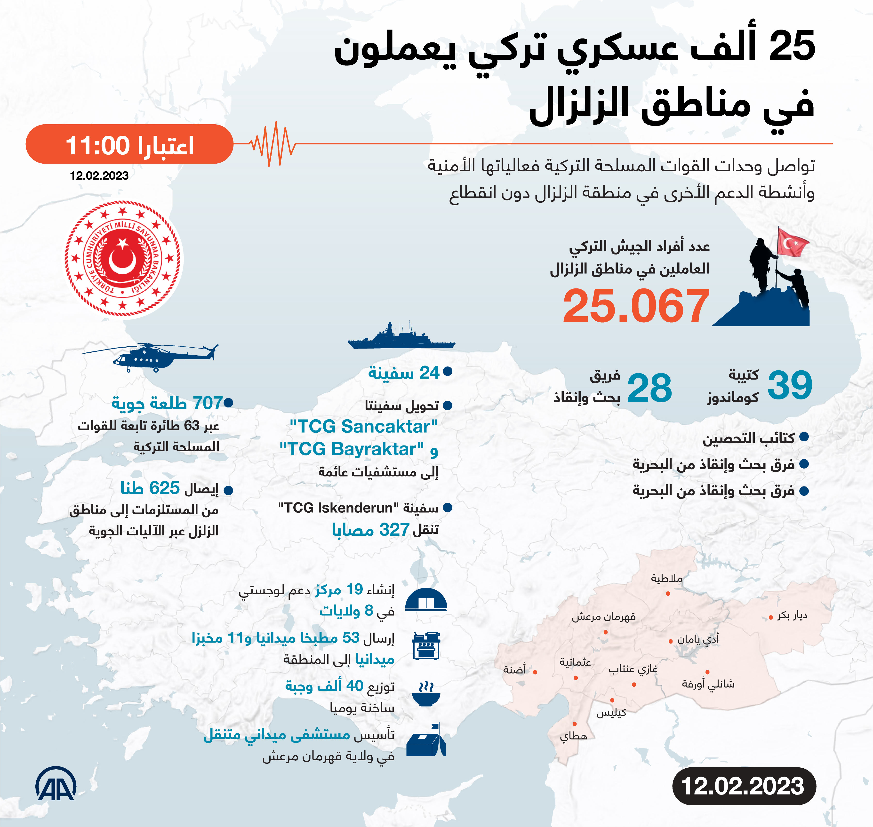 25 ألف عسكري تركي يعملون في مناطق الزلزال