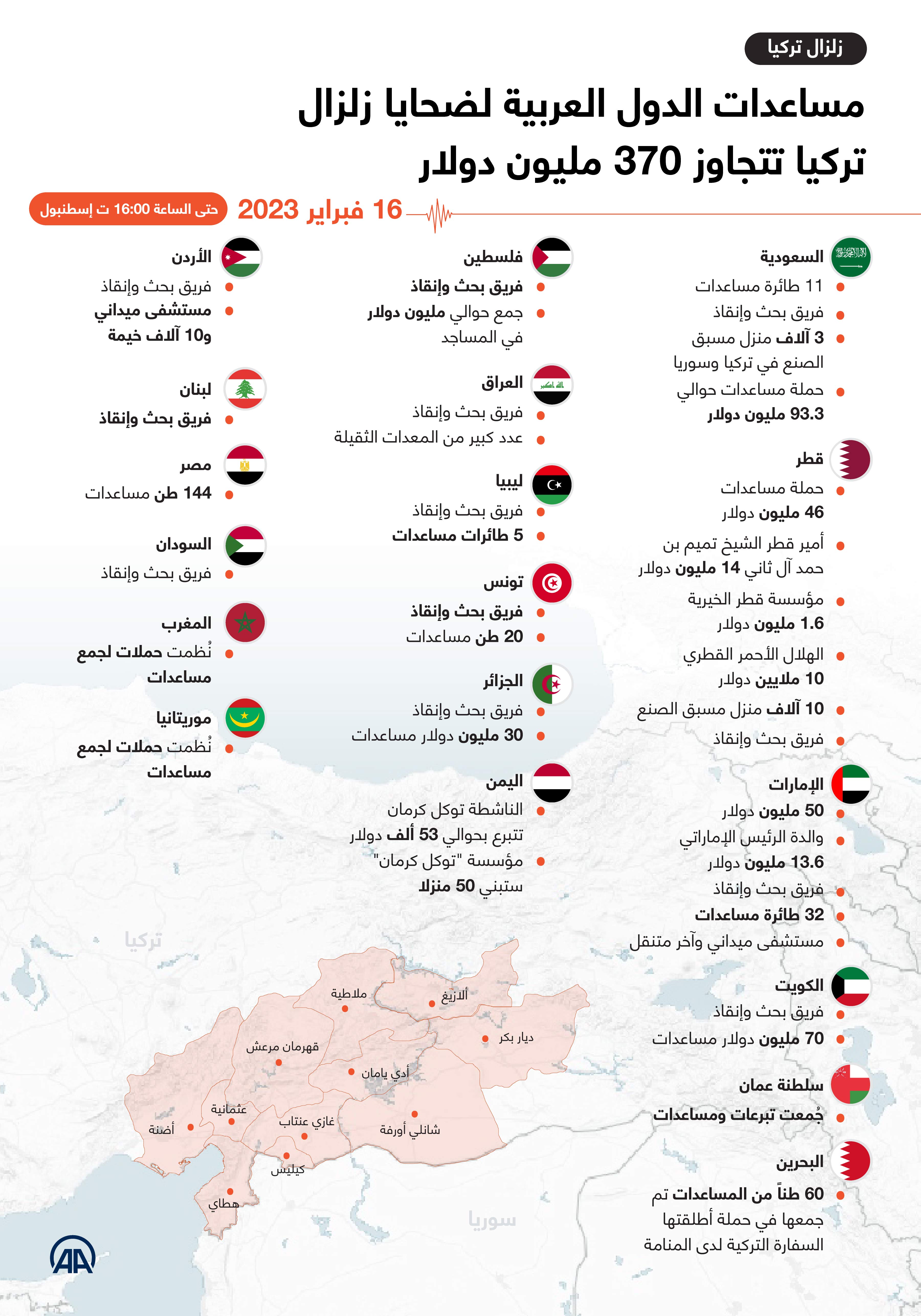 مساعدات الدول العربية لضحايا زلزال تركيا تتجاوز 370 مليون دولار