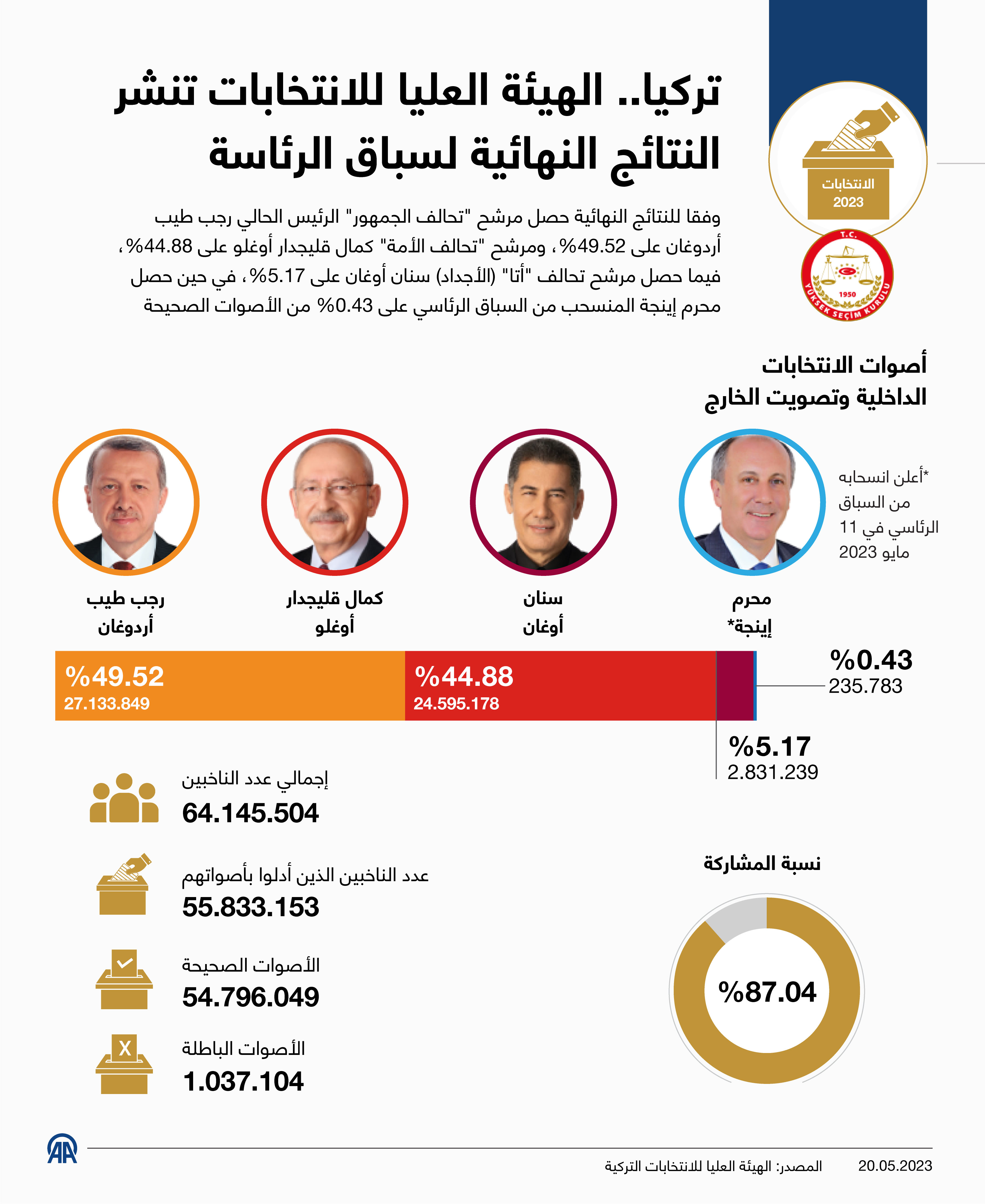تركيا.. الهيئة العليا للانتخابات تنشر النتائج النهائية لسباق الرئاسة