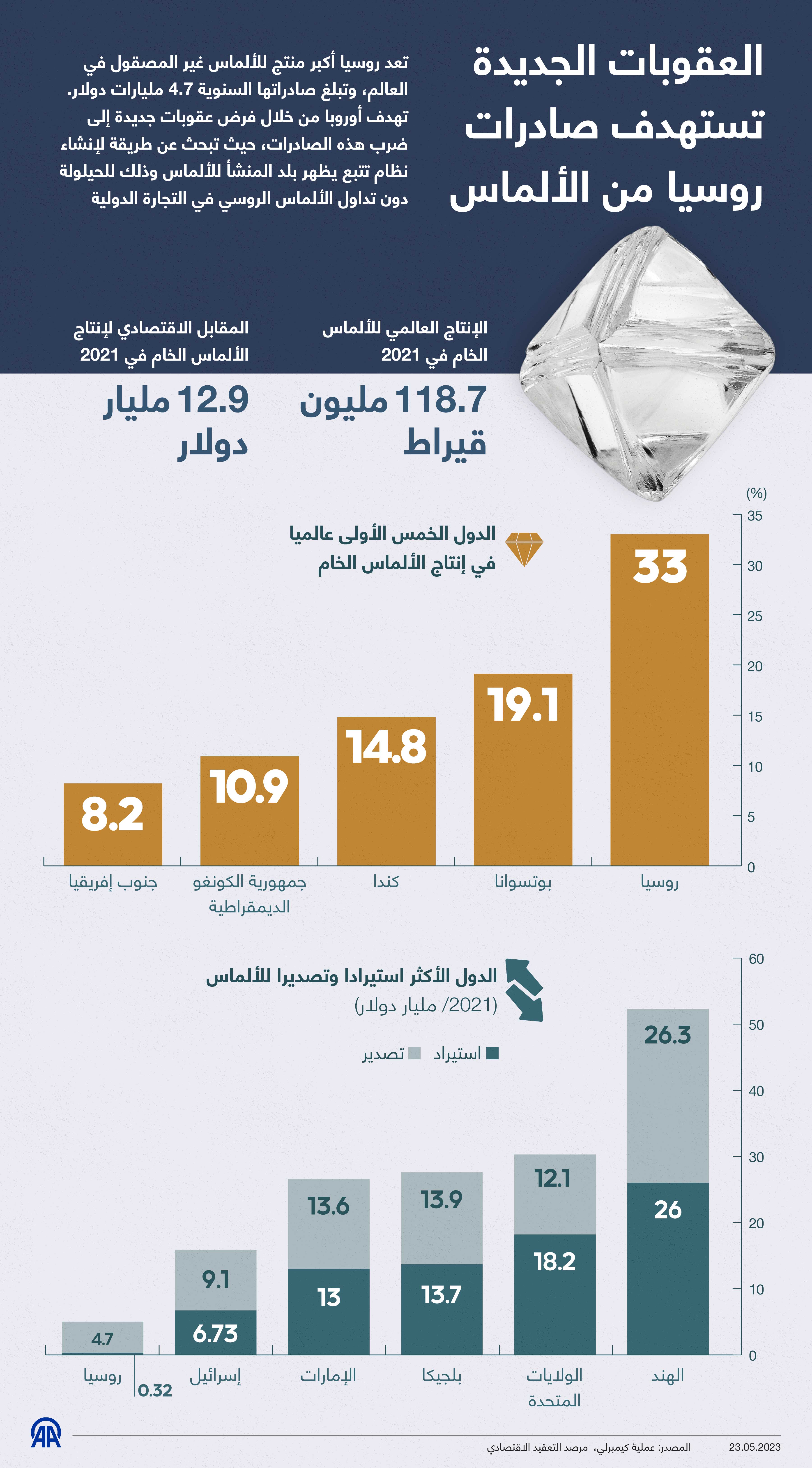 تعد روسيا أكبر منتج للألماس غير المصقول في العالم، وتبلغ صادراتها السنوية 4.7 مليارات دولار. تهدف أوروبا من خلال فرض عقوبات جديدة إلى ضرب هذه الصادرات، حيث تبحث عن طريقة لإنشاء نظام تتبع يظهر بلد المنشأ للألماس وذلك للحيلولة دون تداول الألماس الروسي في التجارة الدولية23 مايو 2023•تحديث: 23 مايو 2023