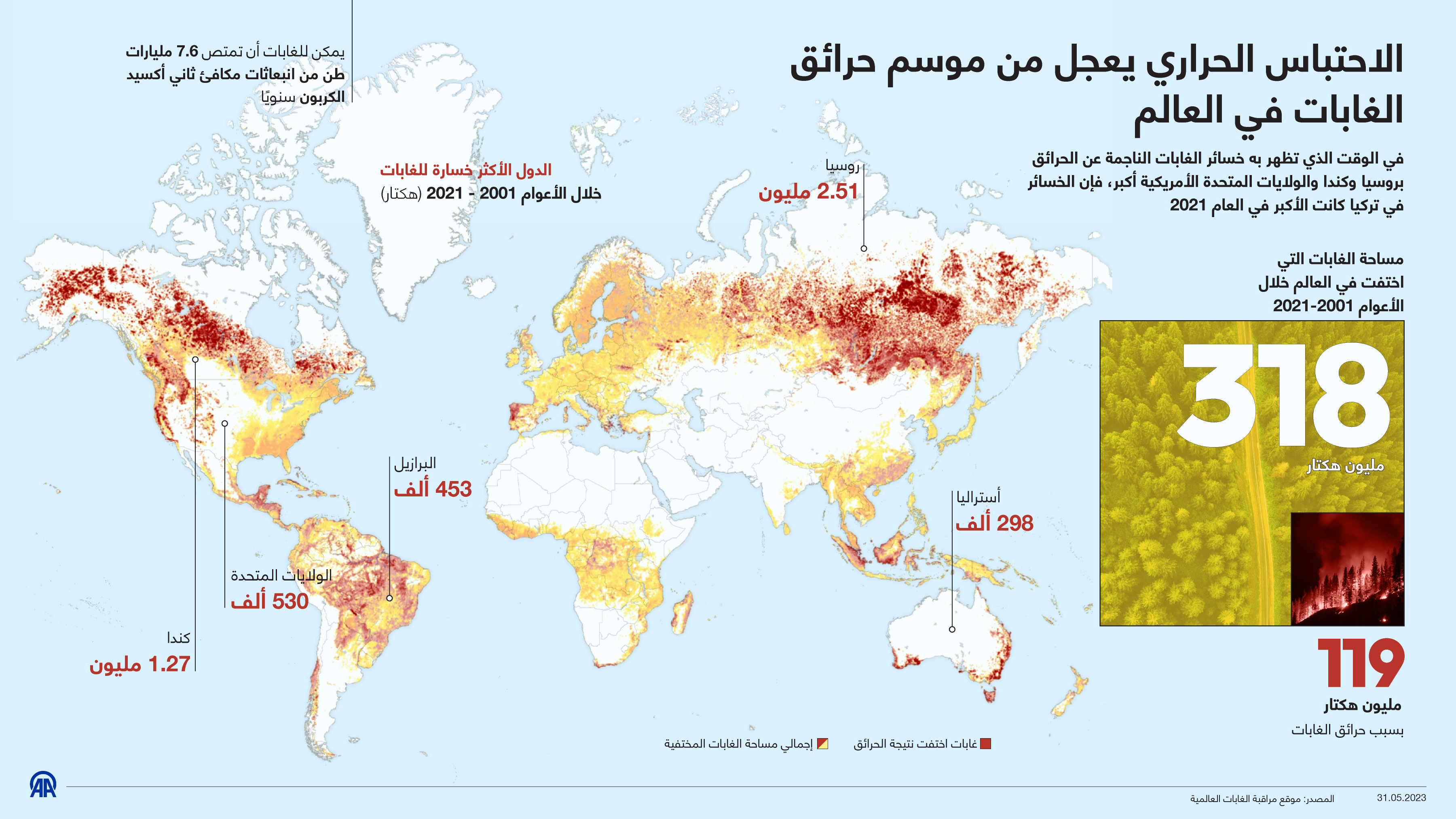 في الوقت الذي تظهر به خسائر الغابات الناجمة عن الحرائق بروسيا وكندا والولايات المتحدة الأمريكية أكبر، فإن الخسائر في تركيا كانت الأكبر في العام 2021