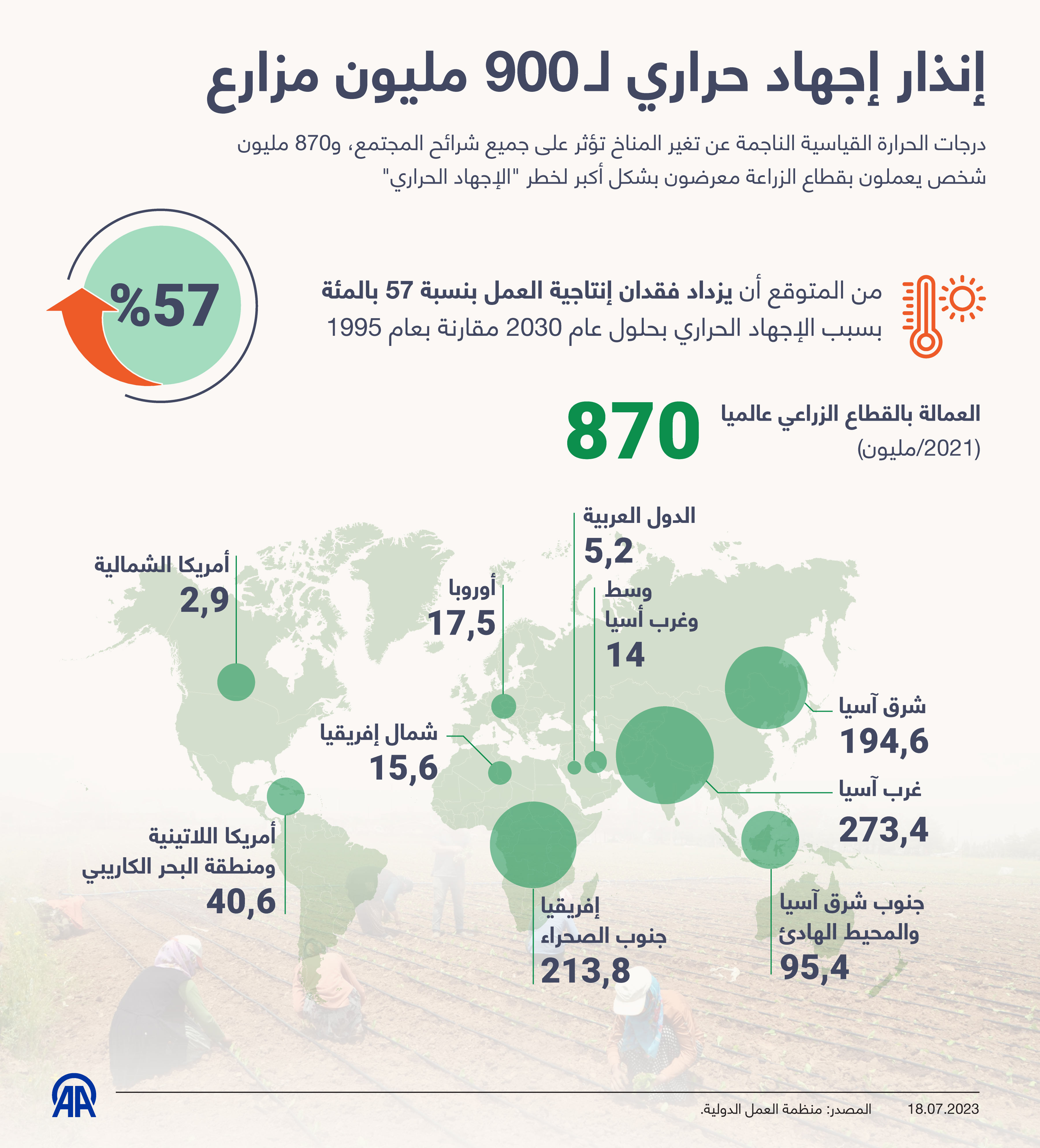 درجات الحرارة القياسية الناجمة عن تغير المناخ تؤثر على جميع شرائح المجتمع، و870 مليون شخص يعملون بقطاع الزراعة معرضون بشكل أكبر لخطر "الإجهاد الحراري"