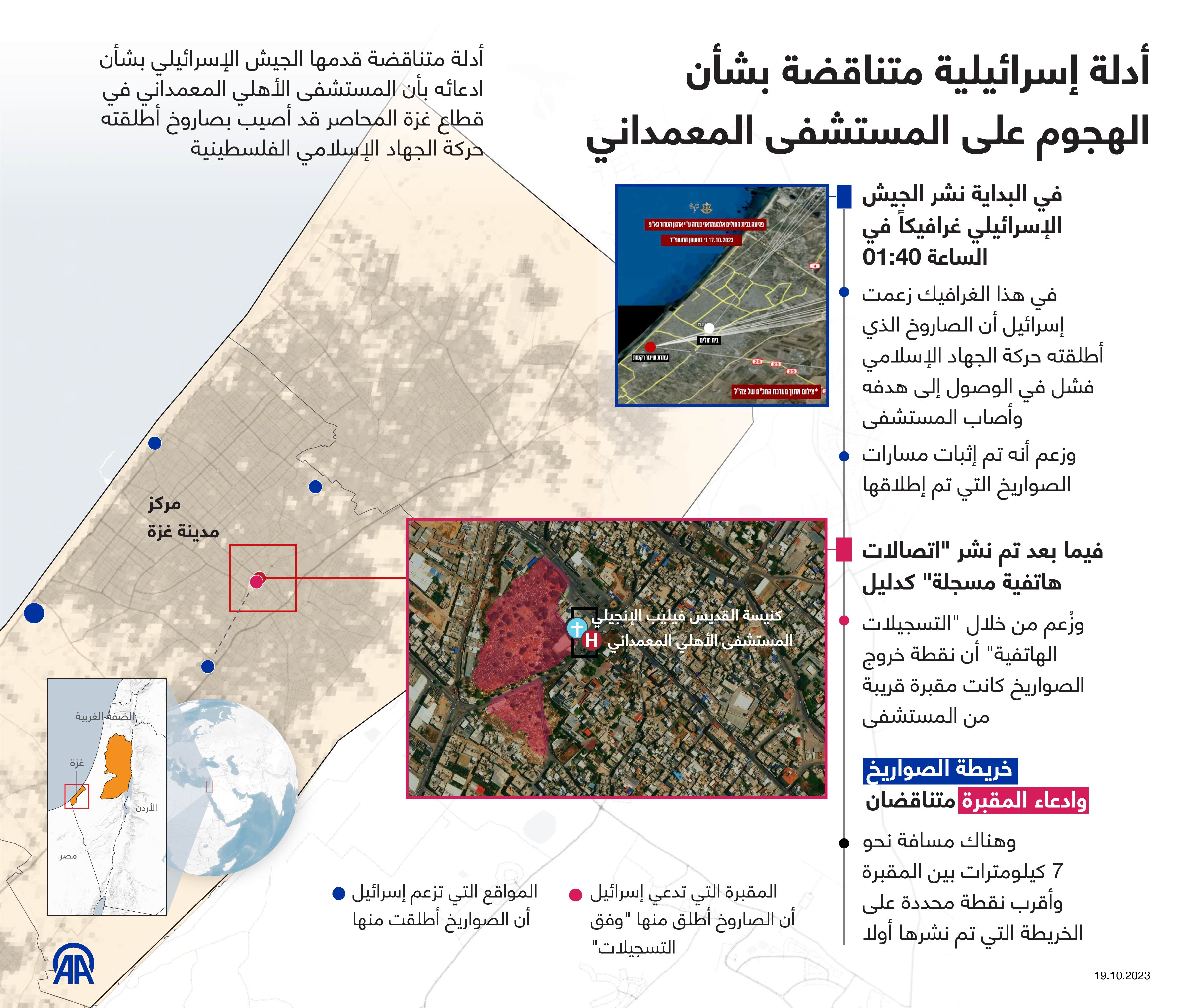 أدلة متناقضة قدمها الجيش الإسرائيلي بشأن ادعائه بأن المستشفى الأهلي المعمداني في قطاع غزة المحاصر قد أصيب بصاروخ أطلقته حركة الجهاد الإسلامي الفلسطينية