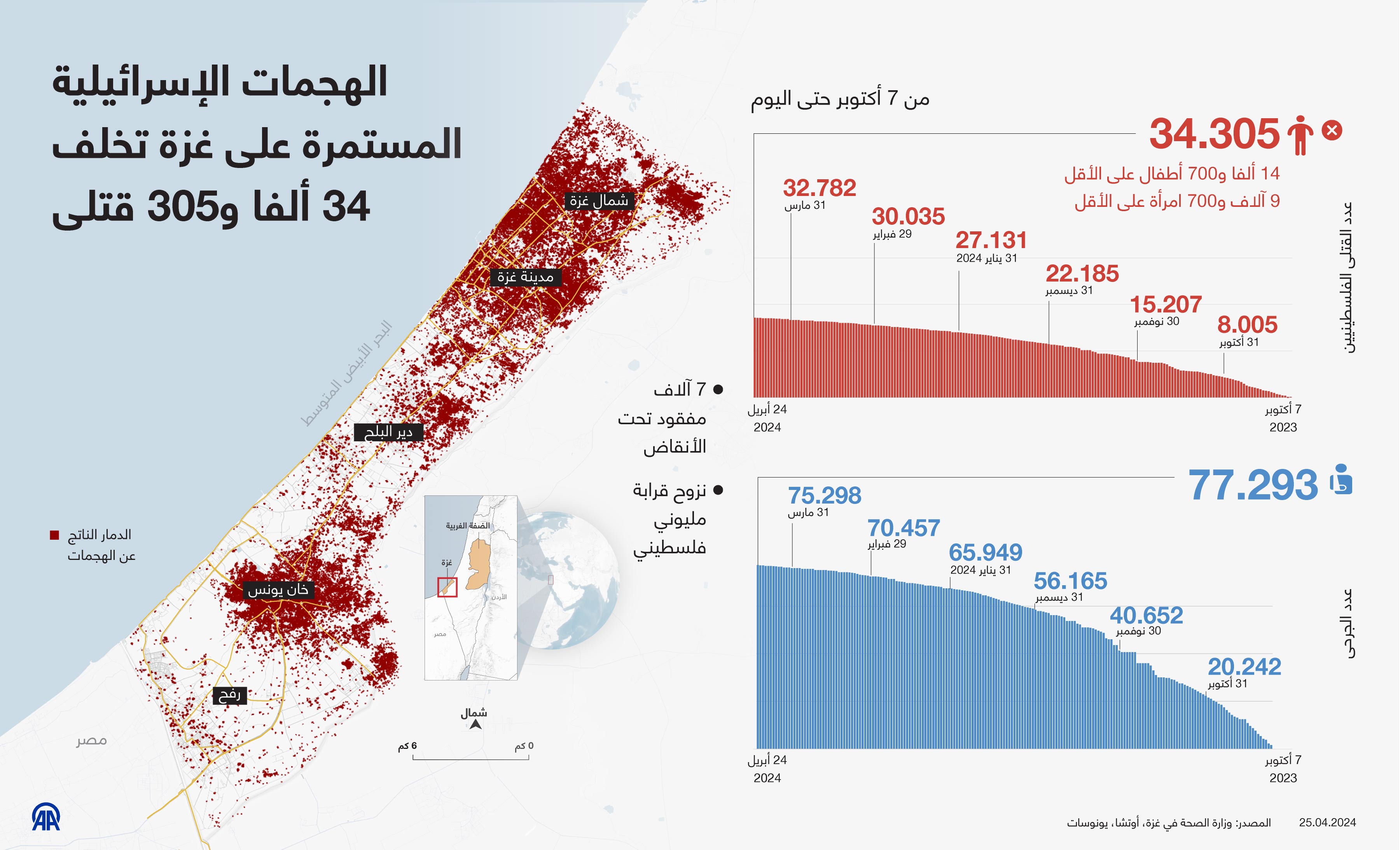 الهجمات الإسرائيلية المستمرة على غزة تخلف 34 ألفا و305 قتلى