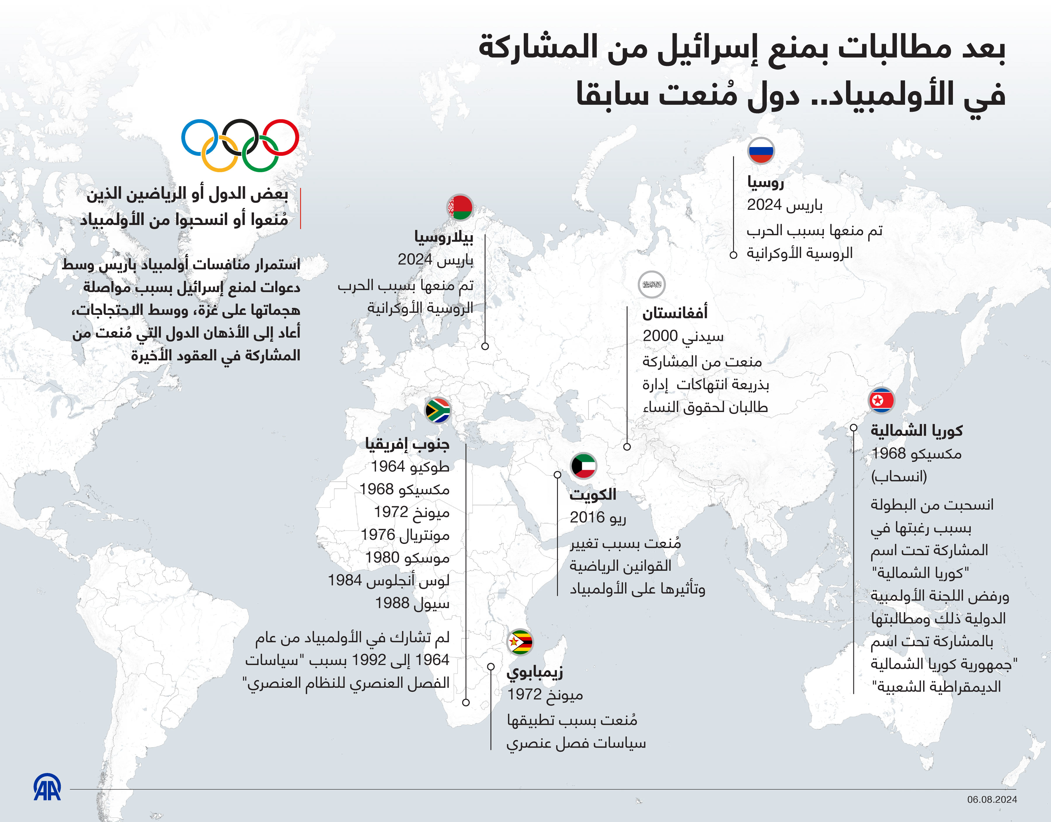 استمرار منافسات أولمبياد باريس وسط دعوات لمنع إسرائيل بسبب مواصلة هجماتها على غزة، ووسط الاحتجاجات، أعاد إلى الأذهان الدول التي مُنعت من المشاركة في العقود الأخيرة