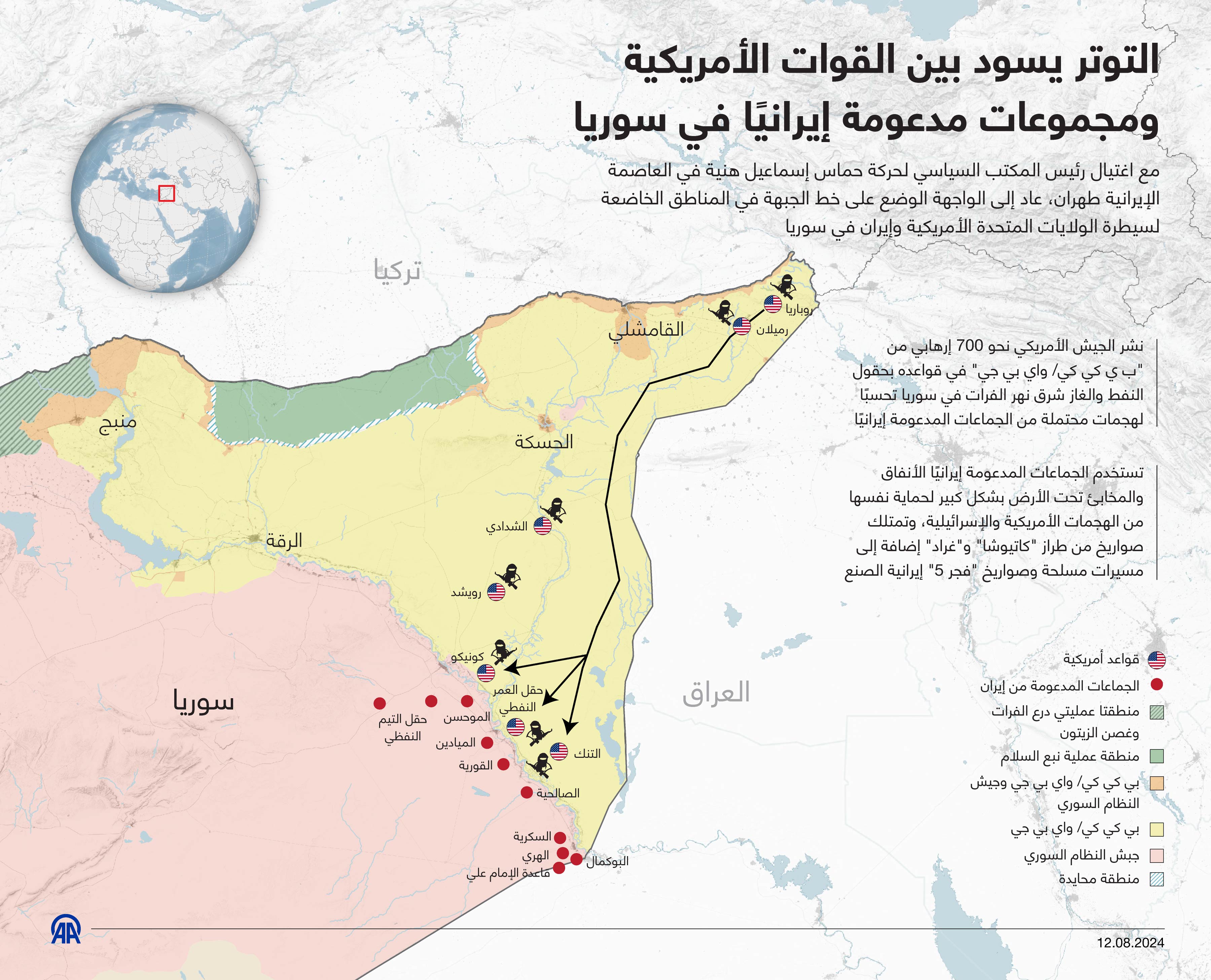 مع اغتيال رئيس المكتب السياسي لحركة حماس إسماعيل هنية في العاصمة الإيرانية طهران، عاد إلى الواجهة الوضع على خط الجبهة في المناطق الخاضعة لسيطرة الولايات المتحدة الأمريكية وإيران في سوريا