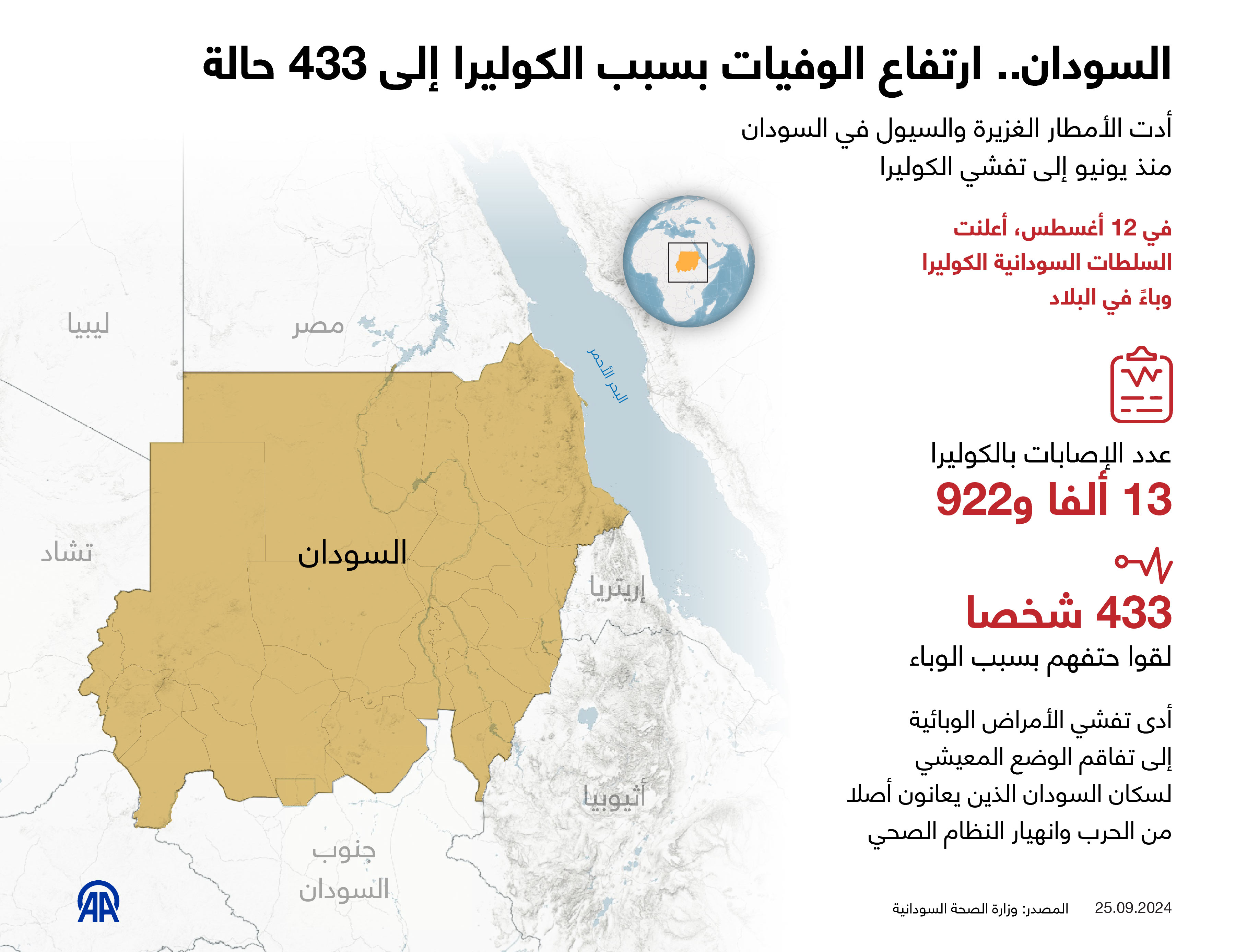 السودان.. ارتفاع الوفيات بسبب الكوليرا إلى 433 حالة