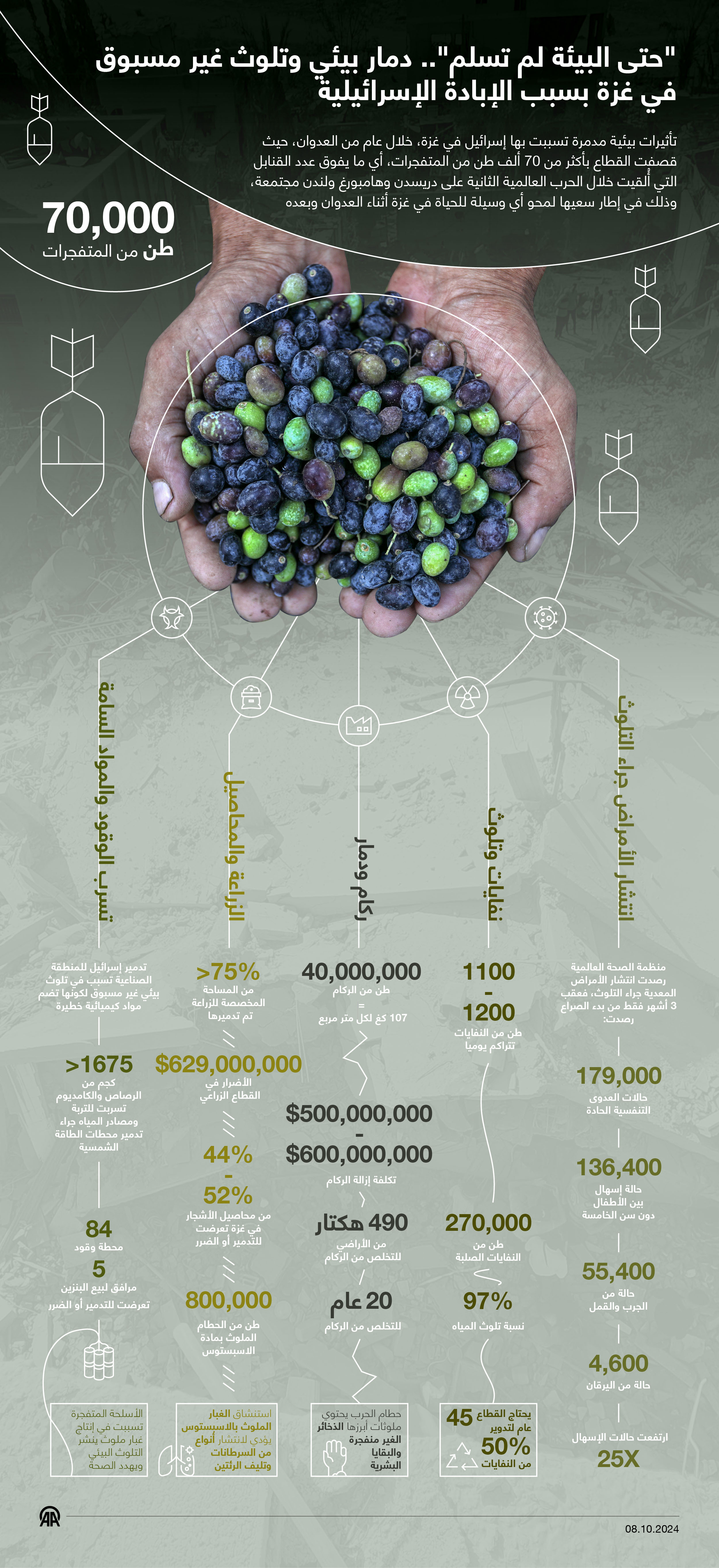 تأثيرات بيئية مدمرة تسببت بها إسرائيل في غزة، خلال عام من العدوان، حيث قصفت القطاع بأكثر من 70 ألف طن من المتفجرات، أي ما يفوق عدد القنابل التي أُلقيت خلال الحرب العالمية الثانية على دريسدن وهامبورغ ولندن مجتمعة، وذلك في إطار سعيها لمحو أي وسيلة للحياة في غزة أثناء العدوان وبعده.09 أكتوبر 2024•تحديث: 09 أكتوبر 2024