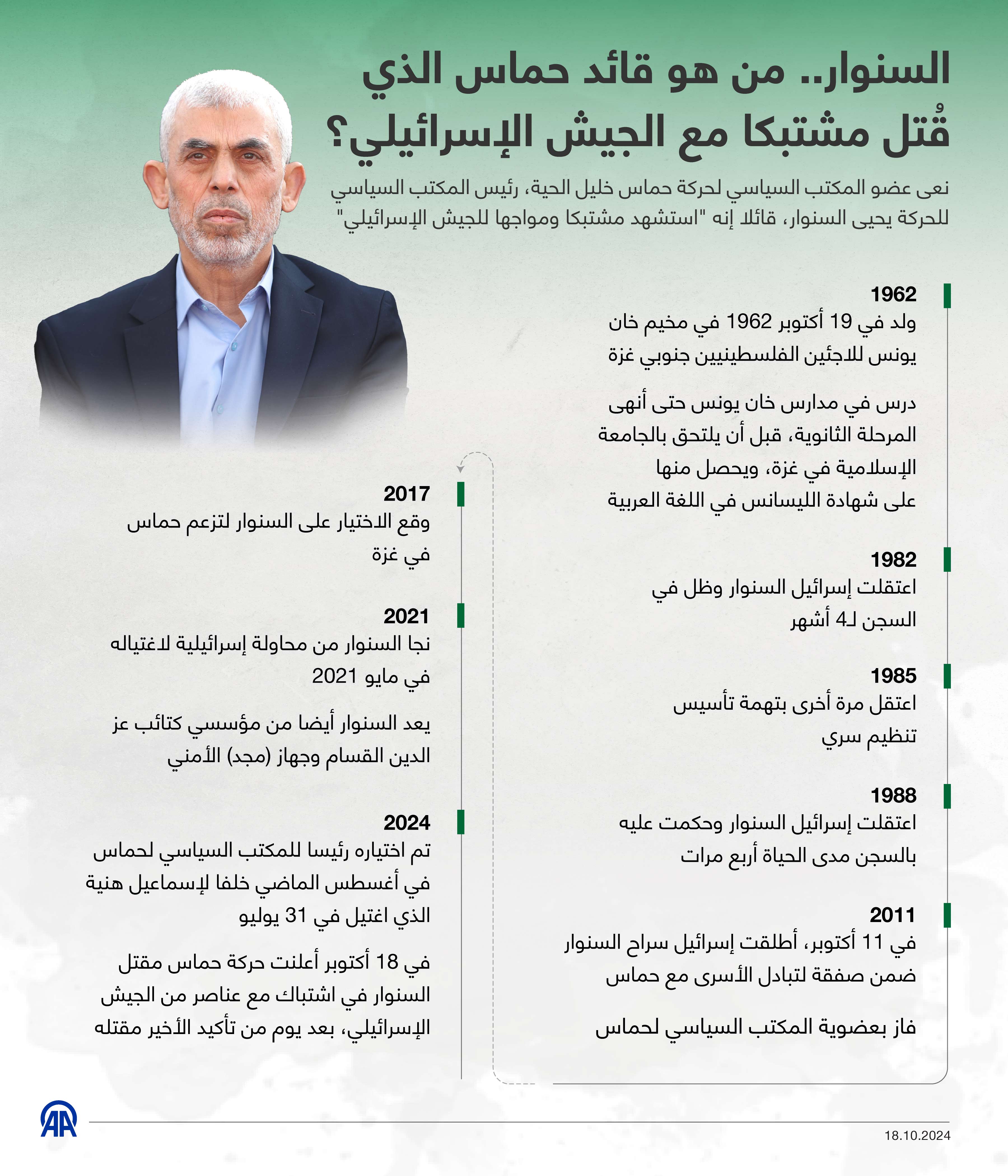 نعى عضو المكتب السياسي لحركة حماس خليل الحية، رئيس المكتب السياسي للحركة يحيى السنوار، قائلا إنه "استشهد مشتبكا ومواجها للجيش الإسرائيلي"