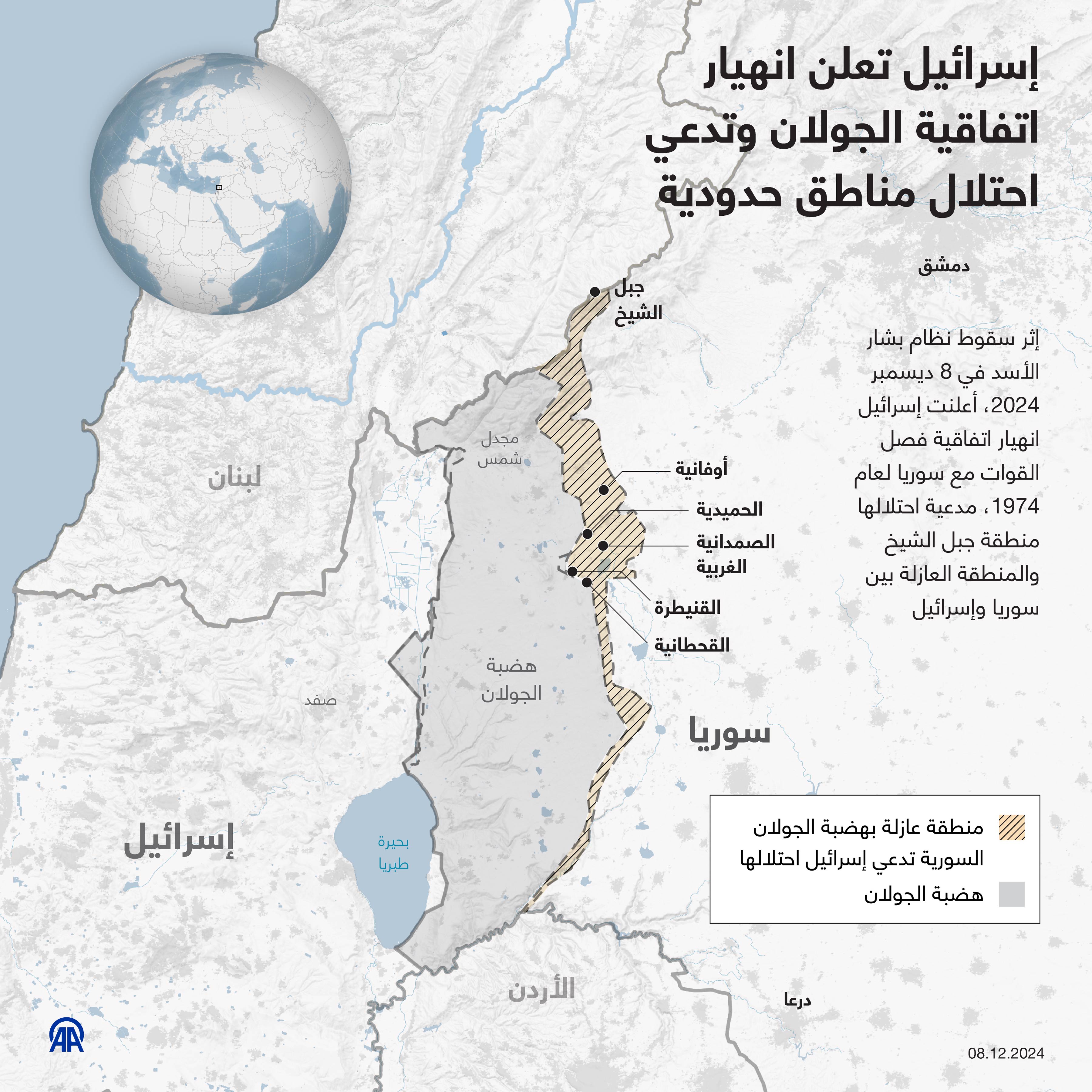 إثر سقوط نظام بشار الأسد في 8 ديسمبر 2024، أعلنت إسرائيل انهيار اتفاقية فصل القوات مع سوريا لعام 1974، مدعية احتلالها منطقة جبل الشيخ والمنطقة العازلة بين سوريا وإسرائيل