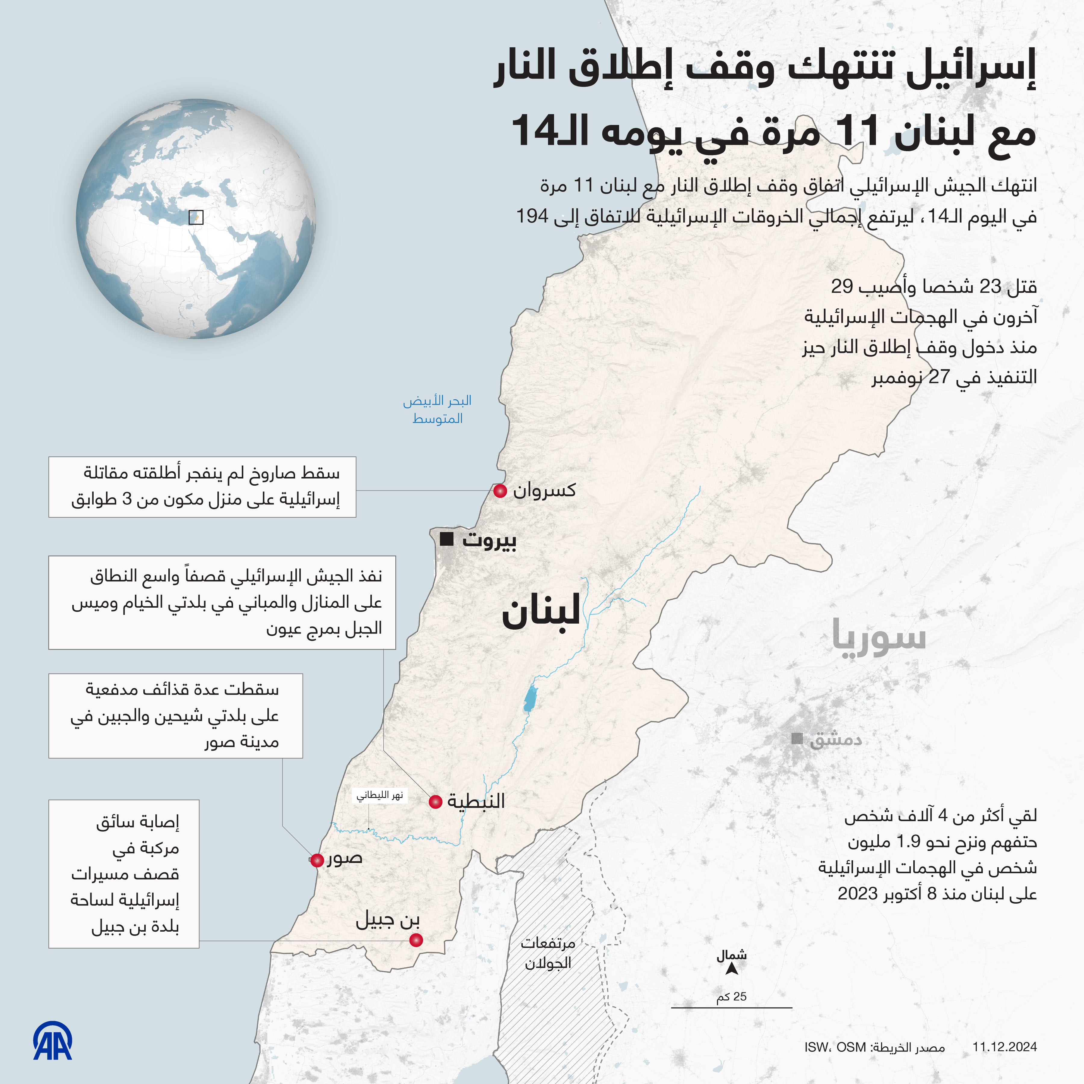 إسرائيل تنتهك وقف إطلاق النار مع لبنان 11 مرة في يومه الـ14