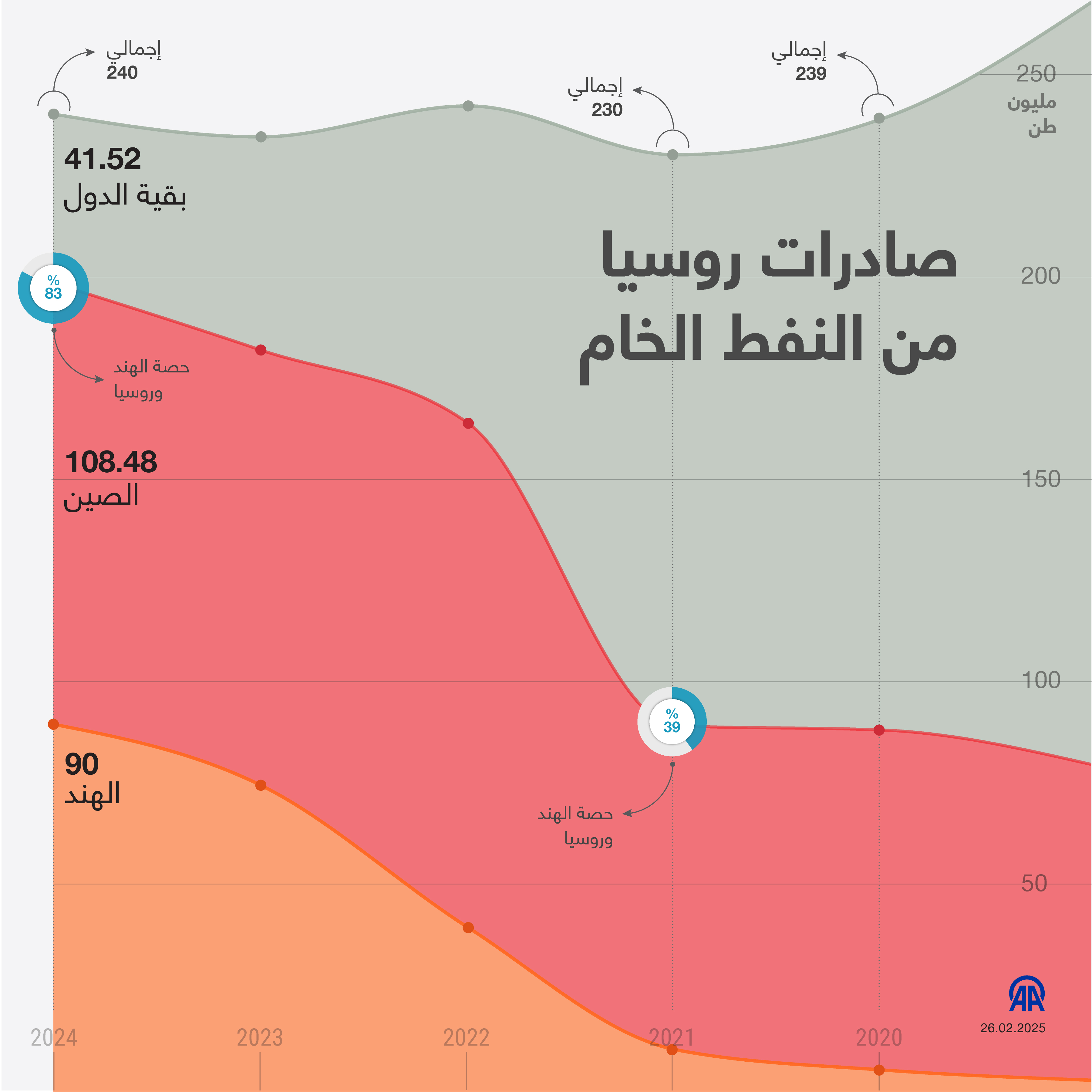 بالرغم مع عدم رفع روسيا إنتاجها من النفط الخام، إلا أن صادراتها النفطية إلى الهند والصين ارتفعت بشكل ملحوظ مدفوعة بالعقوبات الغربية المفروضة عليها بسبب الحرب في أوكرانيا.