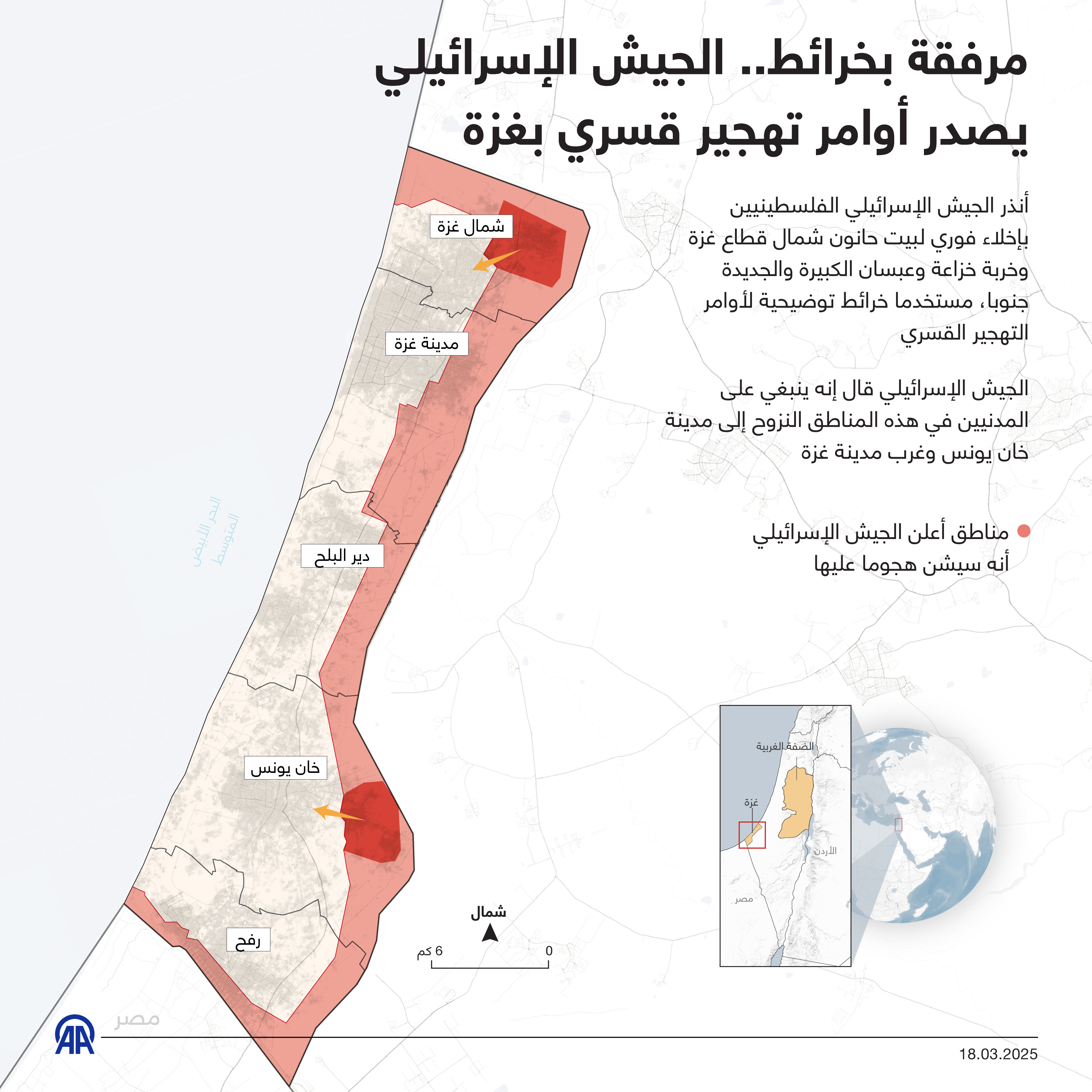 أنذر الجيش الإسرائيلي الفلسطينيين بإخلاء فوري لبيت حانون شمال قطاع غزة وخربة خزاعة وعبسان الكبيرة والجديدة جنوبا، مستخدما خرائط توضيحية لأوامر التهجير القسري.