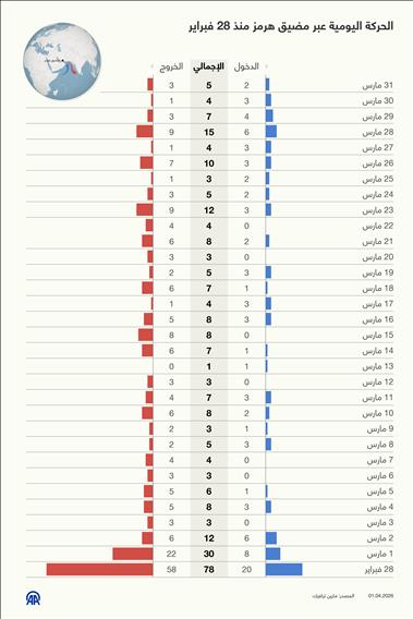 الحركة اليومية عبر مضيق هرمز منذ 28 فبراير