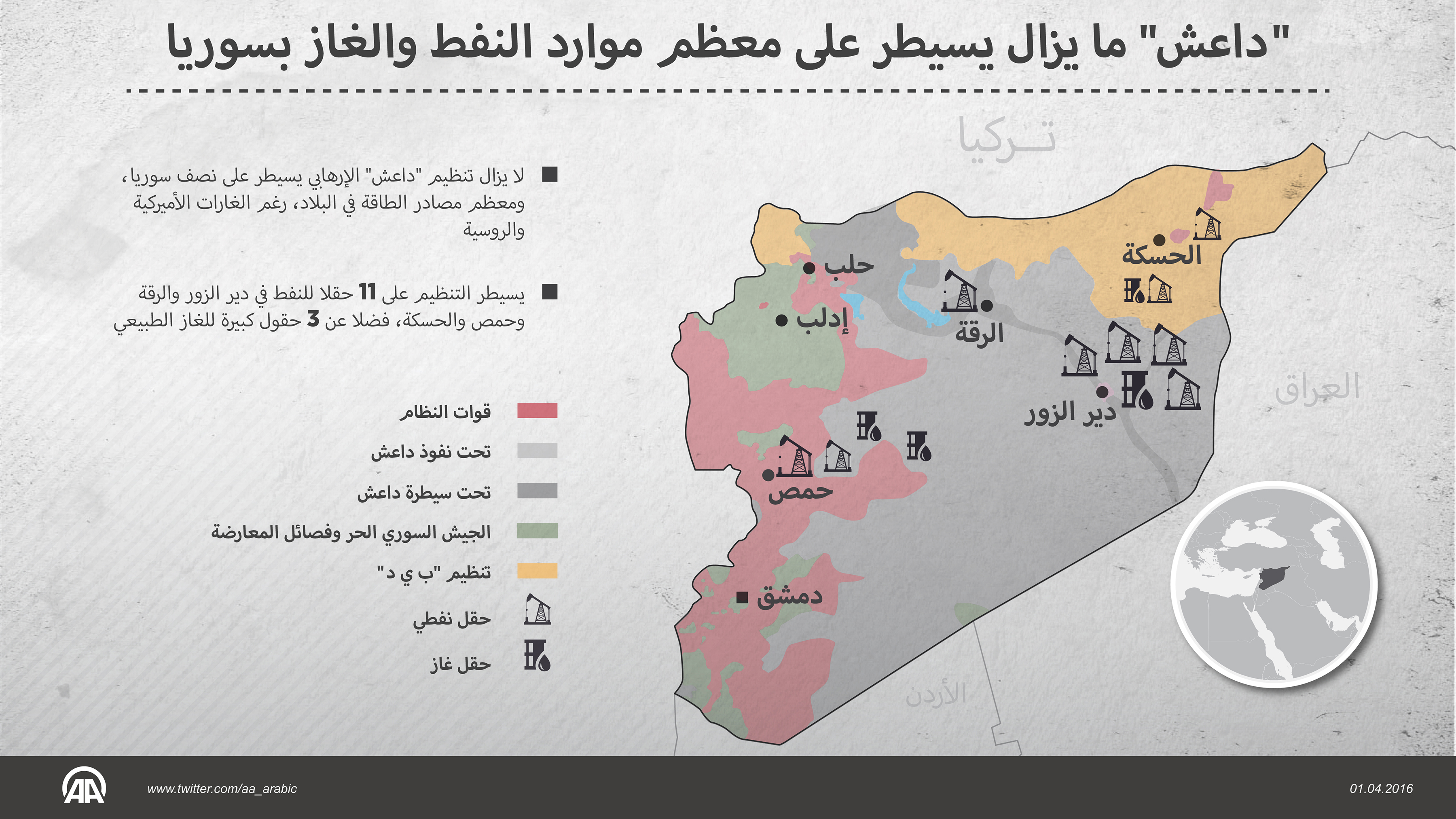 ما يزال تنظيم "داعش" يحافظ على أهم منابع النفط وحقول الغاز في سوريا، إضافة إلى احتفاظه بمساحات واسعة من البلاد، رغم مرور نحو عام ونصف العام على بدء التحالف الدولي، تنفيذ غارات على مواقعه.