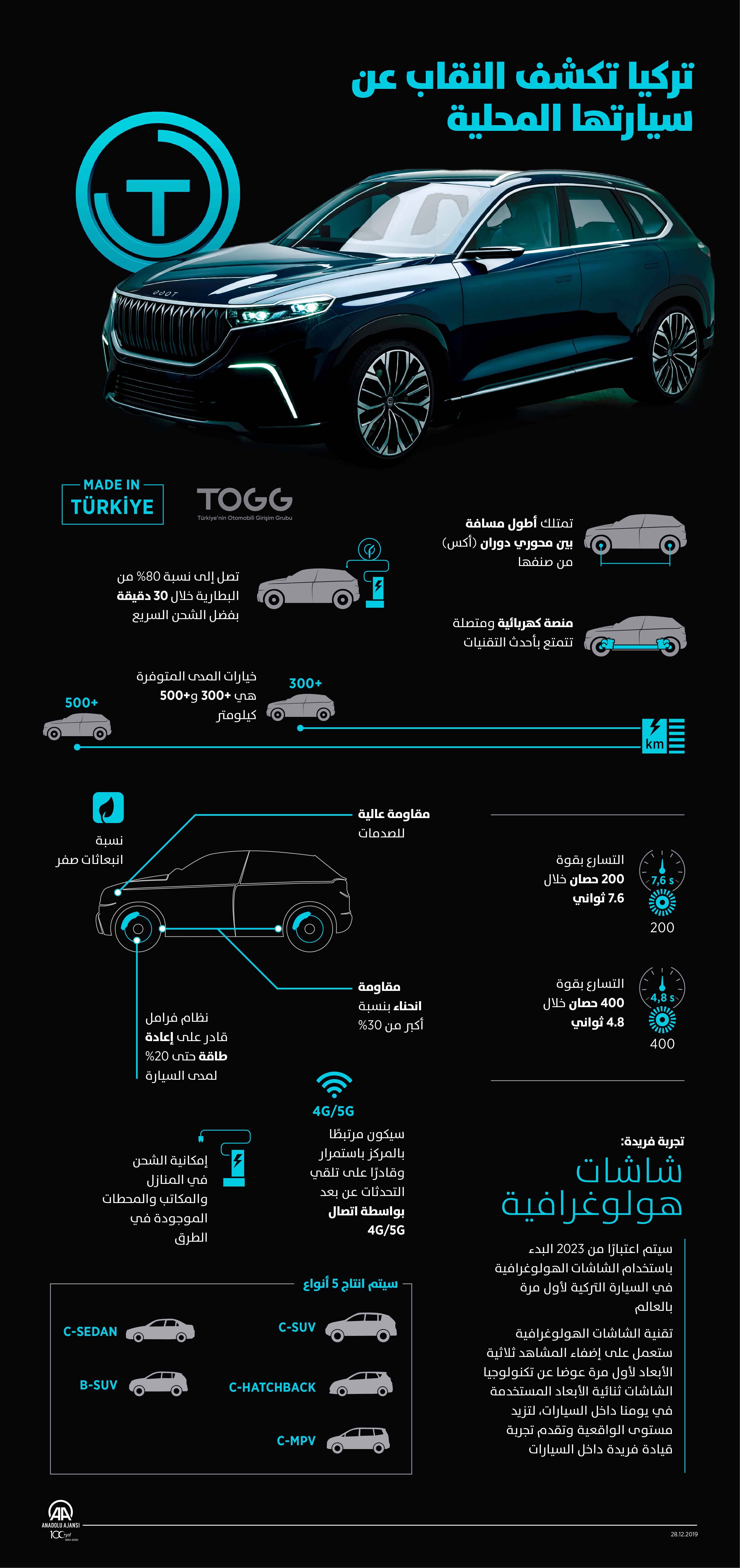 الإعلان عن ميلاد السيارة الوطنية الأولى لتركيا حدث في حفل كبير، أقامته مجموعة مشروع السيارة التركية "TOGG"، وحضره الرئيس التركي، رجب طيب أردوغان، وعدد كبير من الشخصيات التركية من المجالين السياسي والاقتصادي.