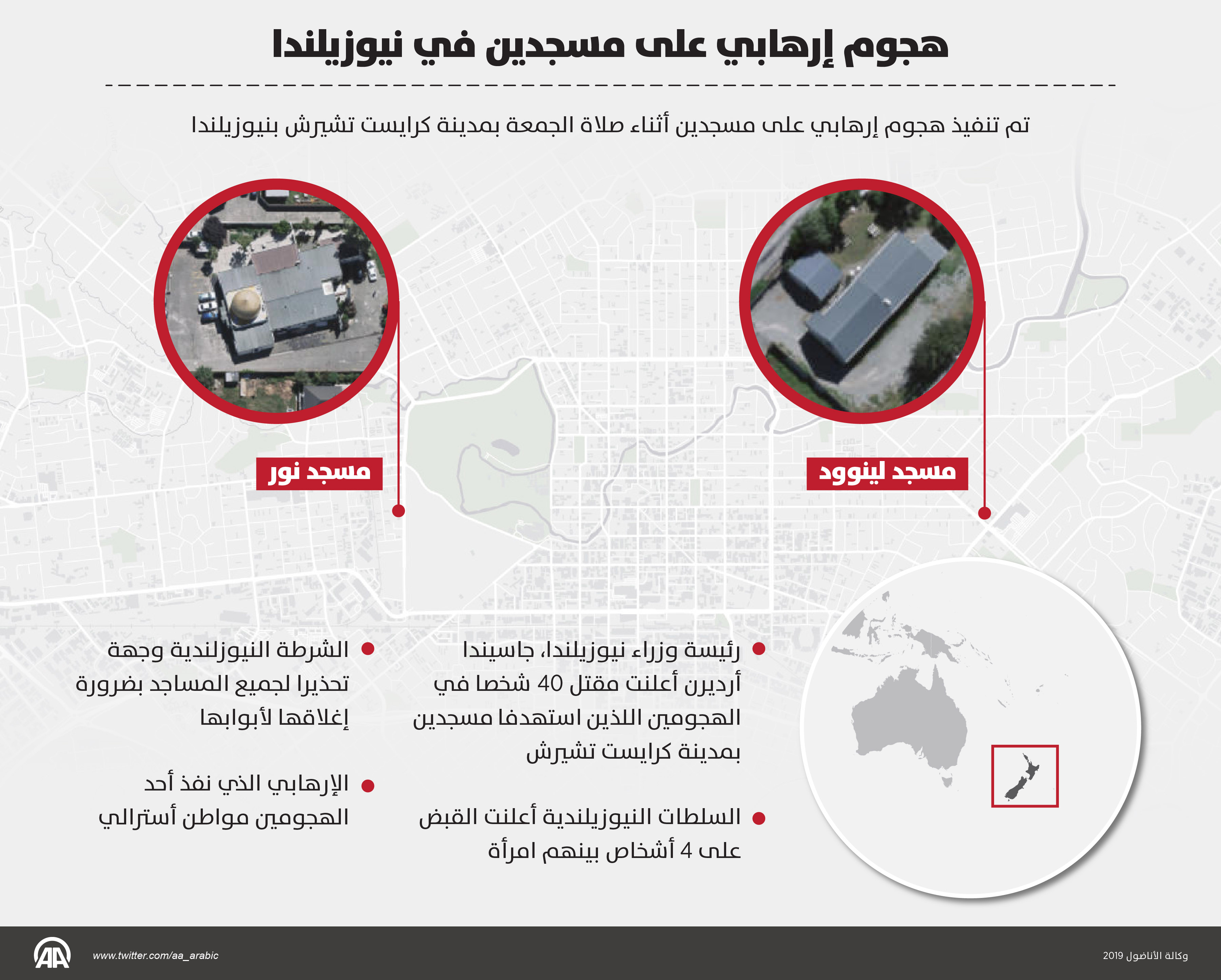 وفي وقت سابق اليوم، أعلنت رئيسة وزراء نيوزيلندا، جاسيندا أرديرن، مقتل 40 شخصا في الهجوم الإرهابي على مسجدين بمدينة كرايست تشيرش.